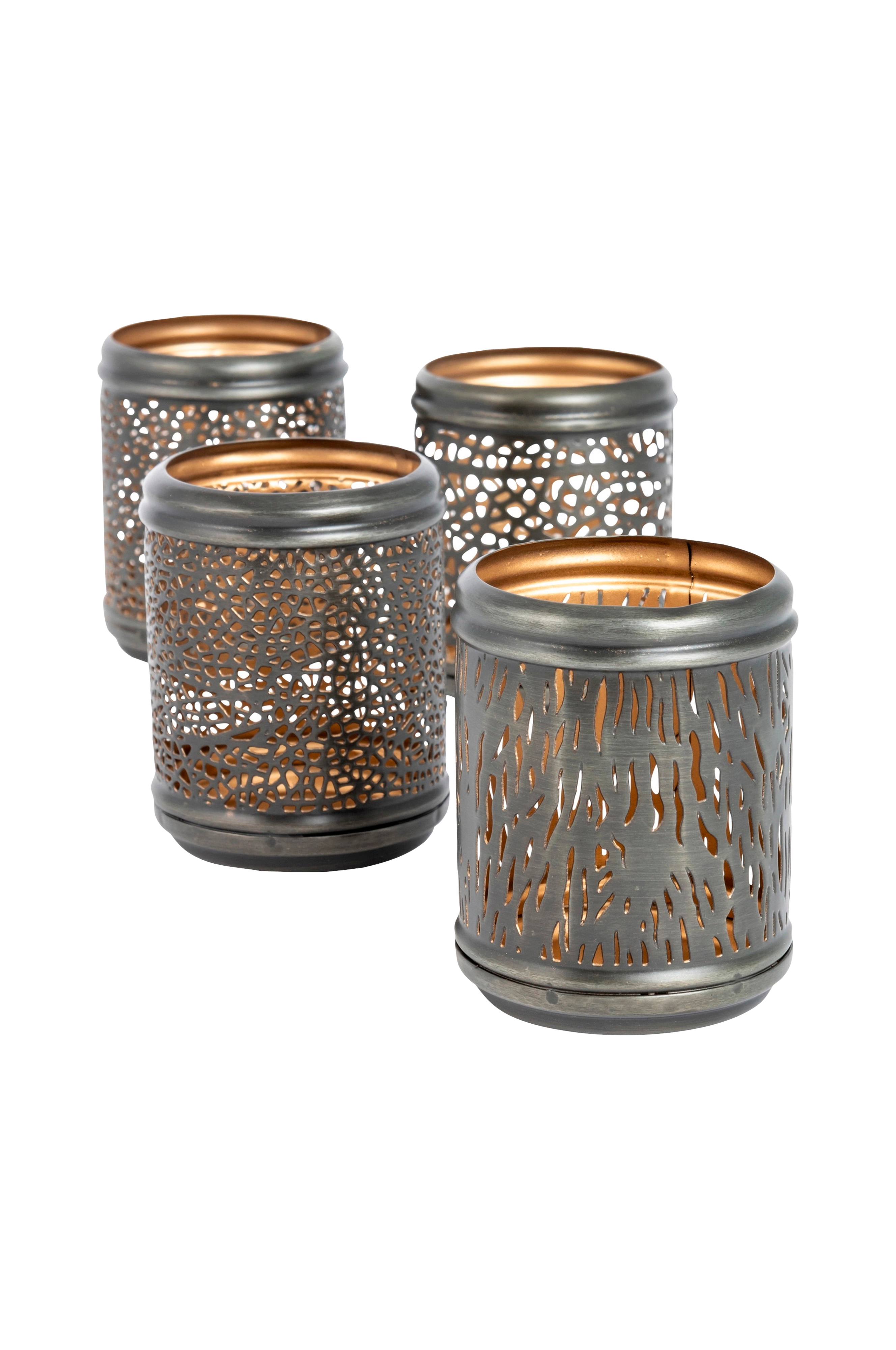 Set med 4 små värmeljushållare i metall, var och en med sitt eget dekorativa hålmönster. Lyktorna har en grå utsida och en gyllene insida, vilket skapar ett vackert varmt sken när ljusen tänds. Set med 4 stycken. Levereras i en vacker presentask. Värmeljushållarna ingår i Halvor Bakkes kollektion