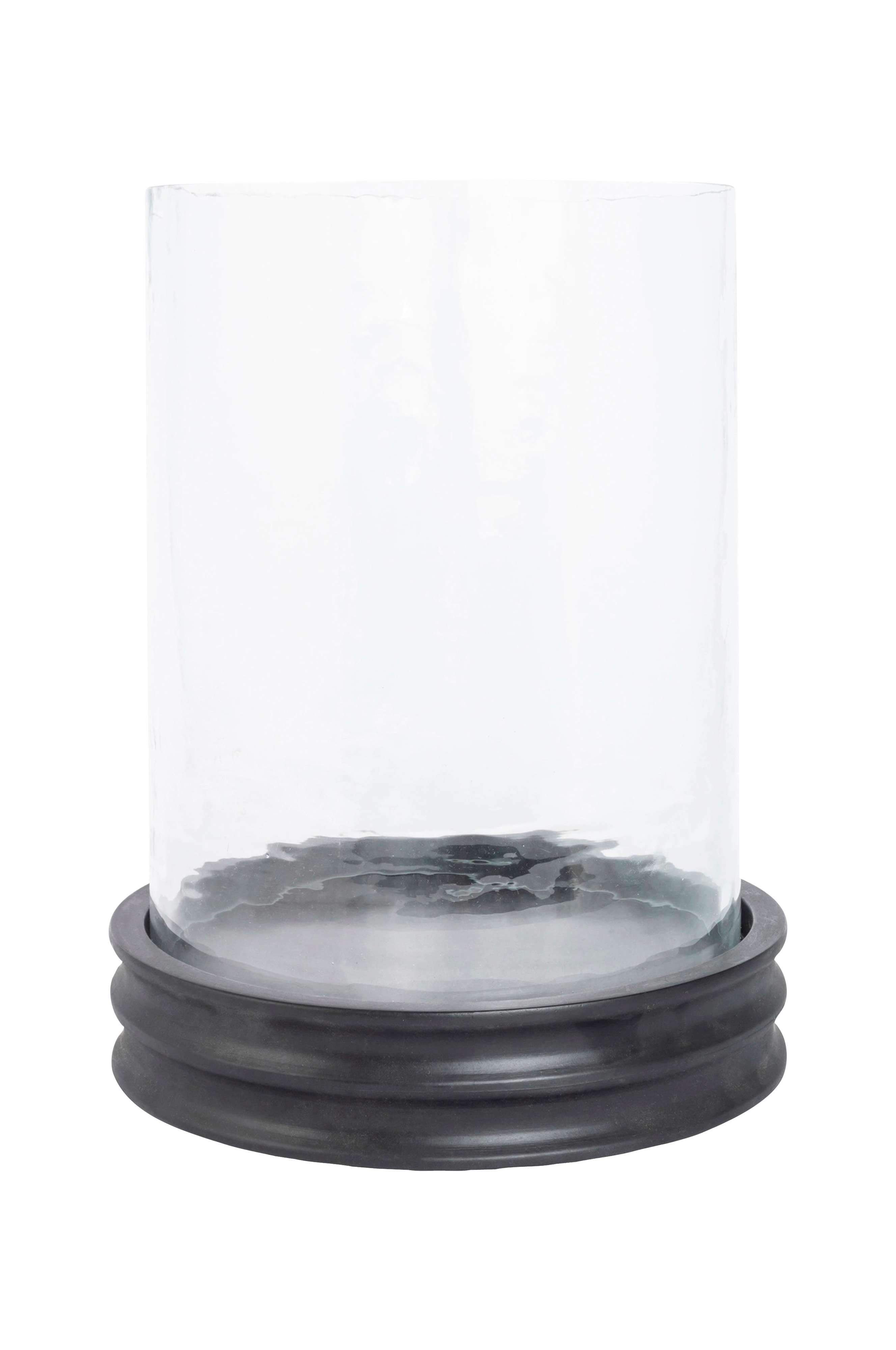 Stor ljusstake med bas i mörkt trä och hamrat glas som skapar en mysig och stämningsfull atmosfär. Pelarljuset avger ett vackert, mjukt ljus som fyller rummet med värme och mysighet. Material: hamrat glas och trä.