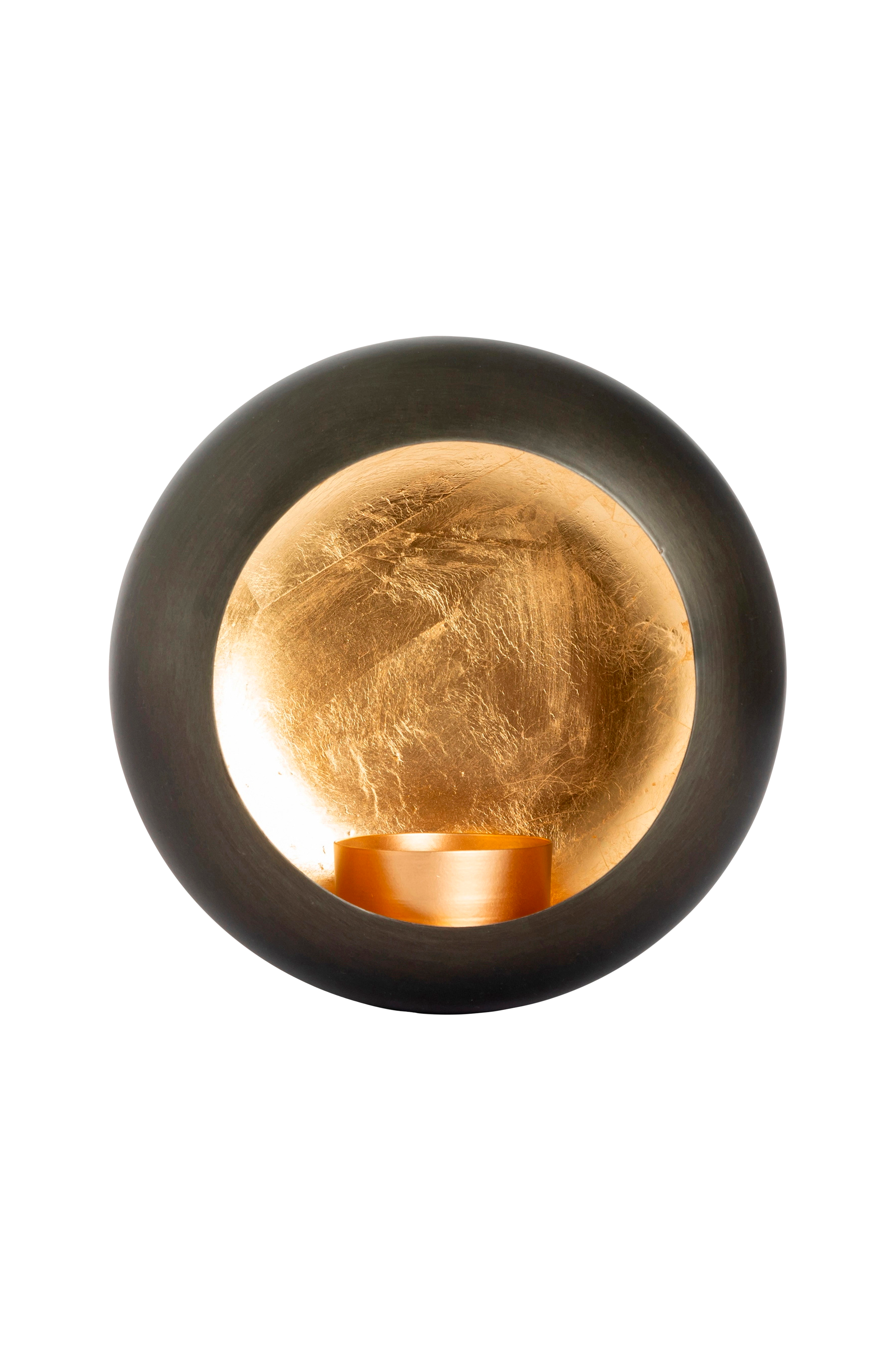 Dessa väggmonterade runda ljusstakar i mattsvart metall med en gyllene insida avger ett vackert och varmt ljus. När de är tända reflekteras det mjuka, gyllene skenet och skapar en inbjudande atmosfär på väggen.