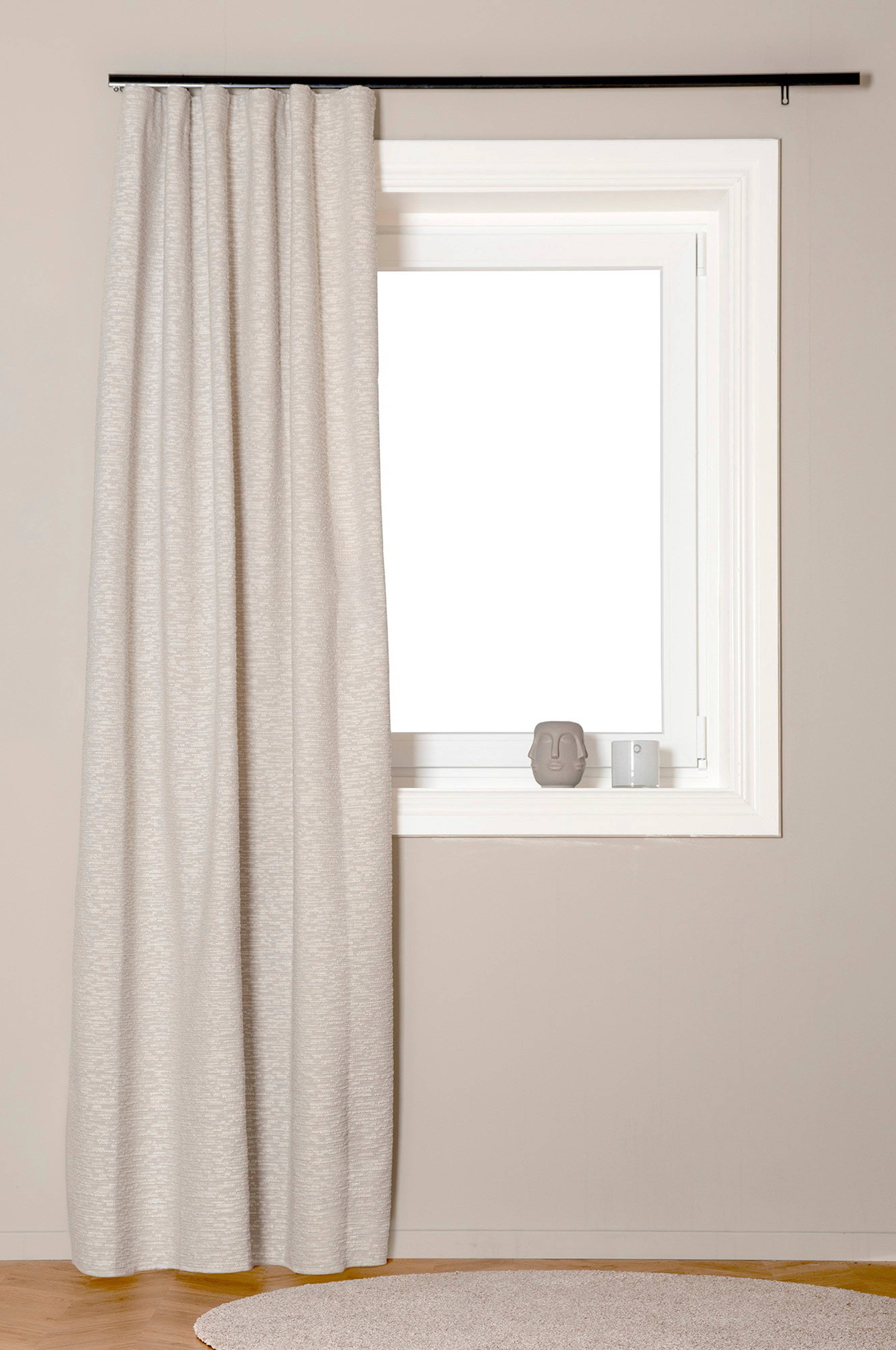 Ljusdämpande gardin i bouclé-tyg. Gardinen har Hastas multigardinband och kan hängas upp på fyra sätt: wave (hotellkänsla),med fingerkrokar, med rynkbandskrokar eller direkt på stången med färdiga hällor. Gardinkrokar ingår inte. Observera att förpackningen innehåller en gardinlängd.