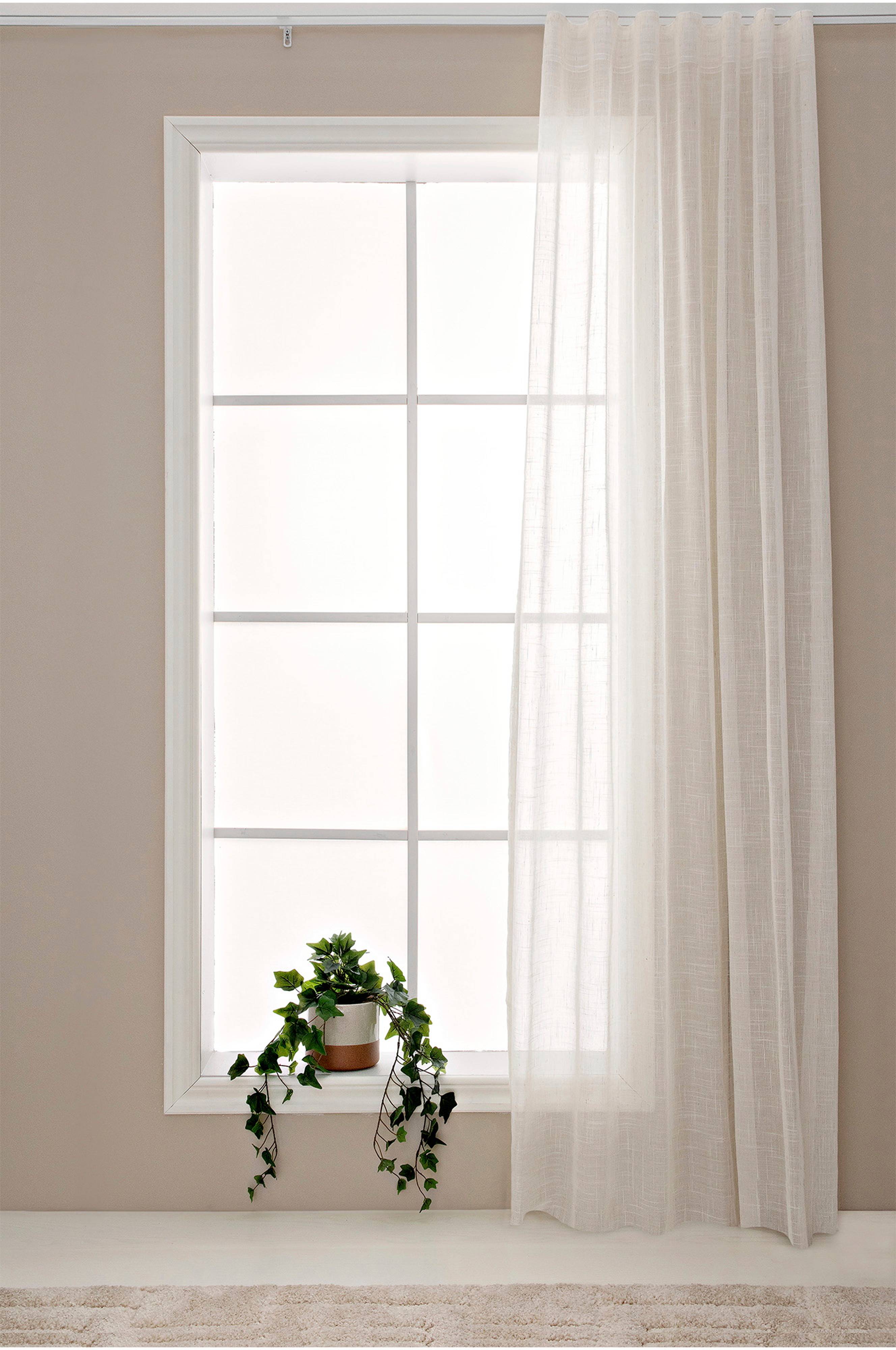 Skir gardin med strukturerat mönster. Flexibelt kombiband med fyra olika alternativ för upphängning av gardinlängder: på en gardinstång med hjälp av hällor, med fingerkrok eller med rynkbandskrok. Krokar ingår inte. Observera att förpackningen innehåller en gardinlängd.