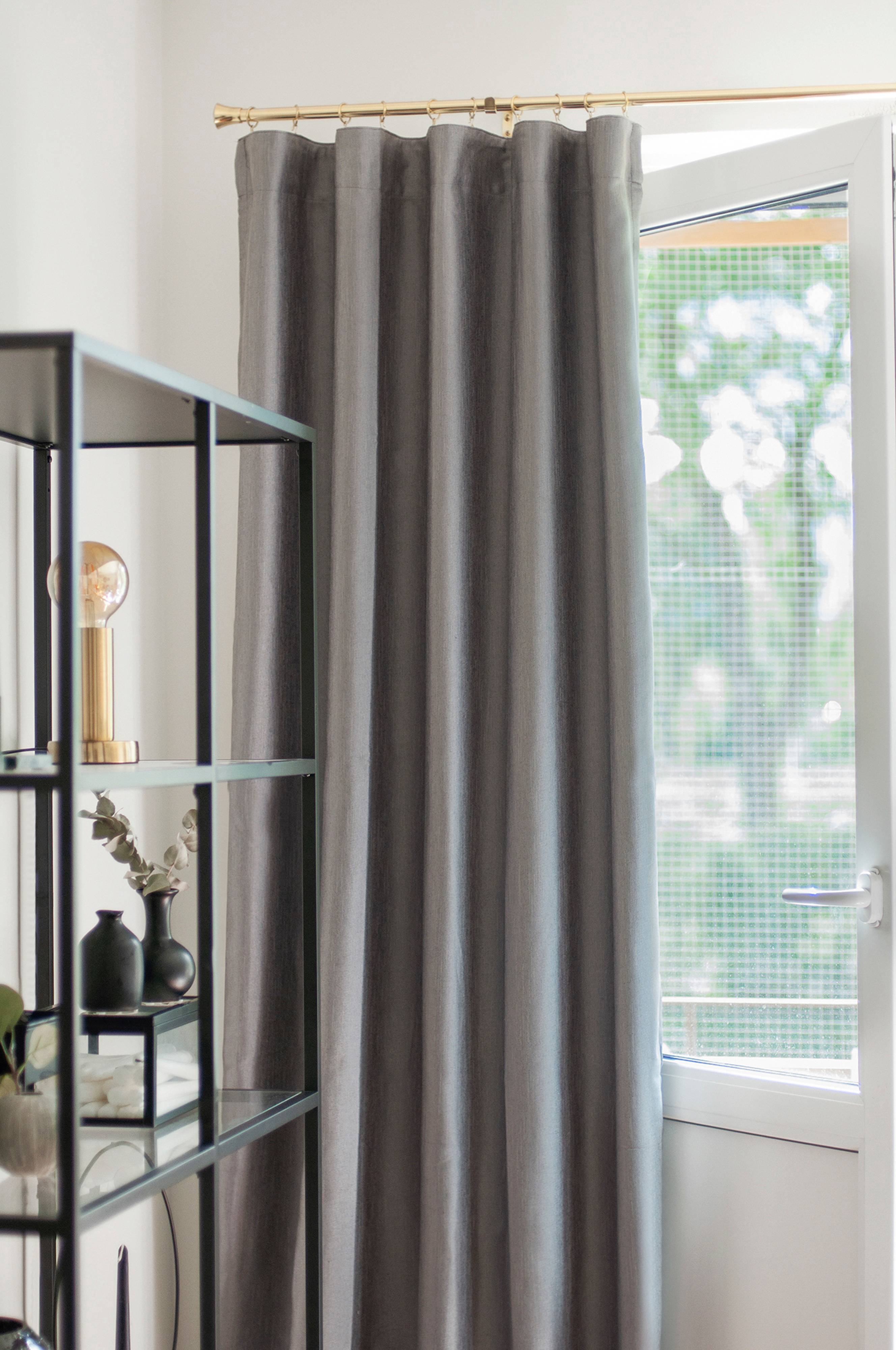 Gardin i ett lite tjockare, fint strukturerat tyg, 80% mörkläggande. Gardinen har Hastas comboband, vilket betyder att du kan sätta upp gardinen direkt på stång med hällor, eller i skena/stång med fingerkrokar eller rynkbandskrokar. 100% polyester. 132x250 cm.