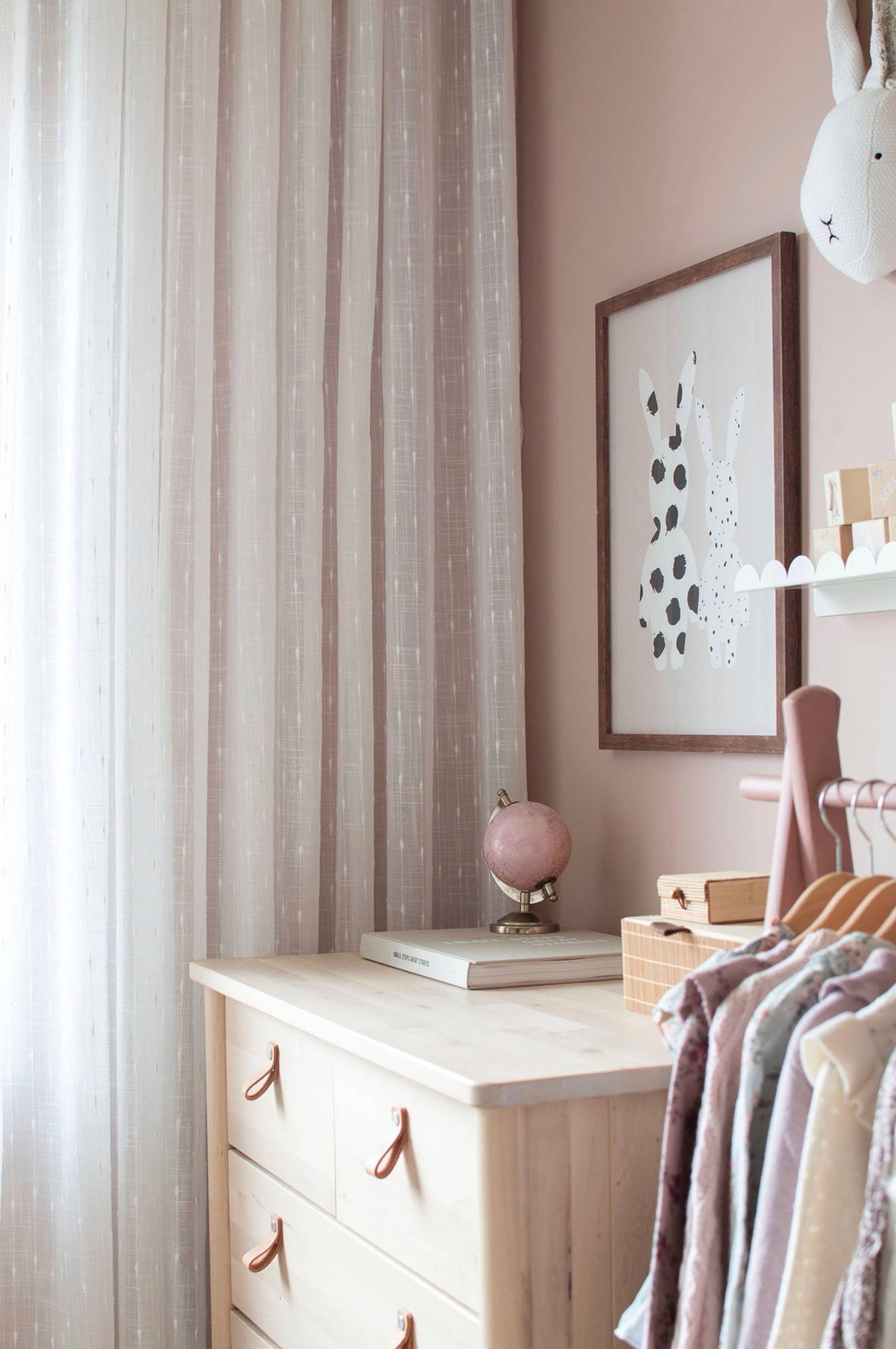 Skir gardin med vävt mönster. Flexibelt kombiband med fyra olika alternativ för upphängning av gardinlängder: på en gardinstång med hjälp av hällor, med fingerkrok eller med rynkbandskrok. Krokar ingår inte. Observera att förpackningen innehåller en gardinlängd.