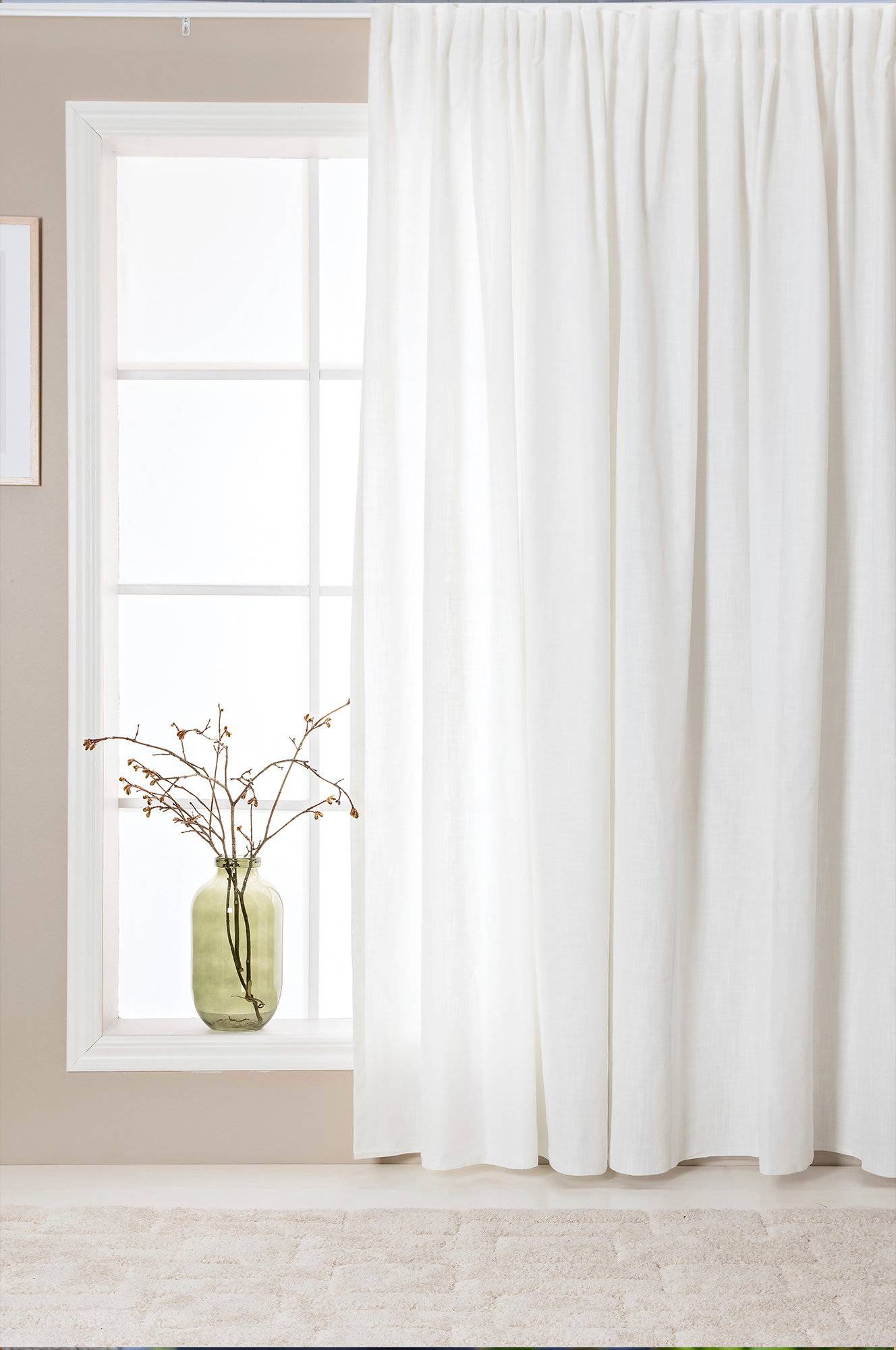 Gardin i rustik stil med linnelook. Extra bred, kraftig gardin med linnestruktur. Flexibelt kombiband med fyra olika alternativ för upphängning av gardinlängder: på en gardinstång med hjälp av hällor, med fingerkrok eller med rynkbandskrok. Krokar ingår inte. Observera att förpackningen innehåller en gardinlängd.