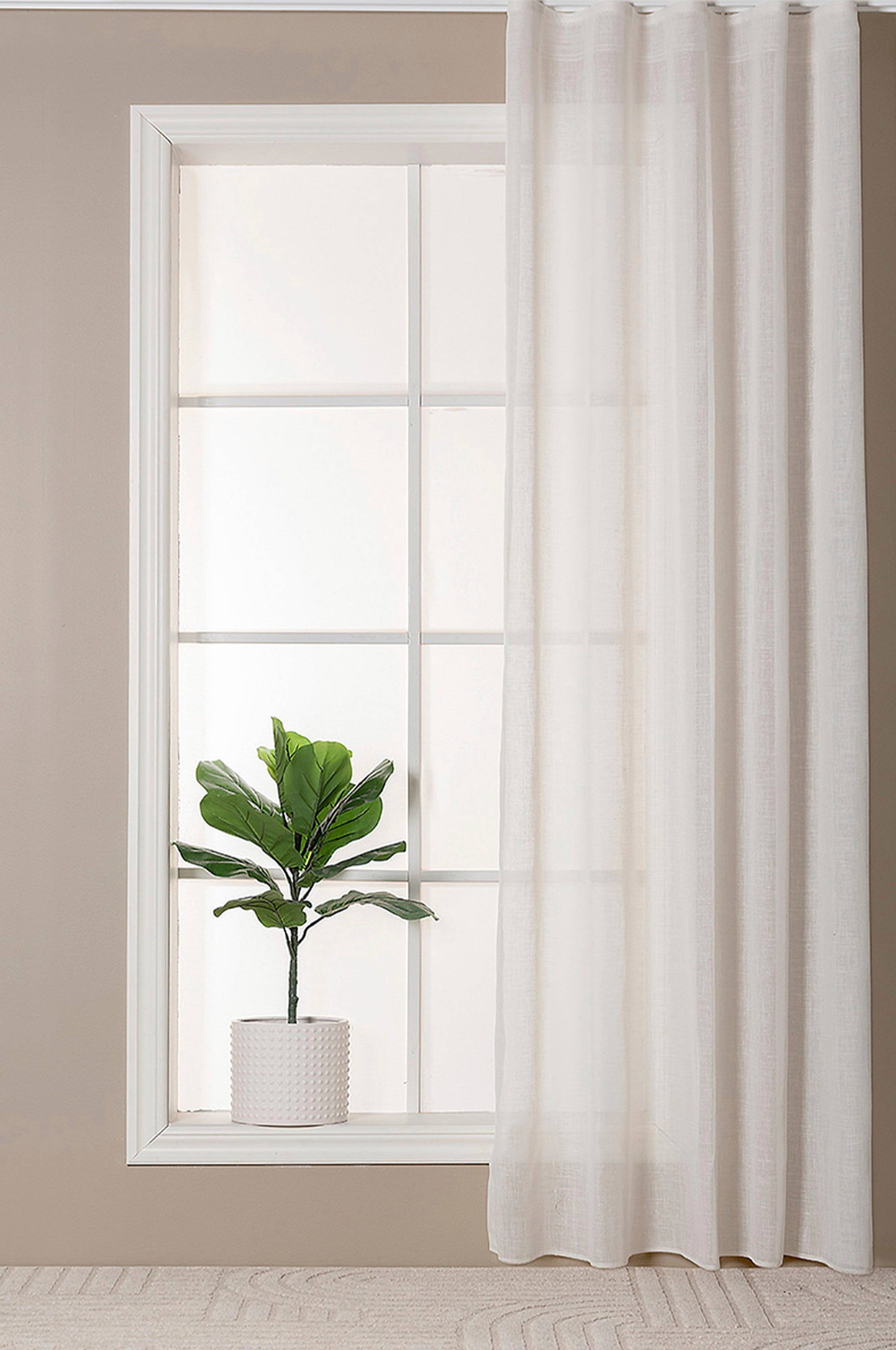 Skir gardin med linnestruktur. Gardinen har Hastas multigardinband och kan hängas upp på fyra sätt: wave (hotellkänsla), med fingerkrokar, med rynkbandskrokar eller direkt på stången med färdiga hällor. Gardinkrokar ingår inte. Observera att förpackningen innehåller en gardinlängd.