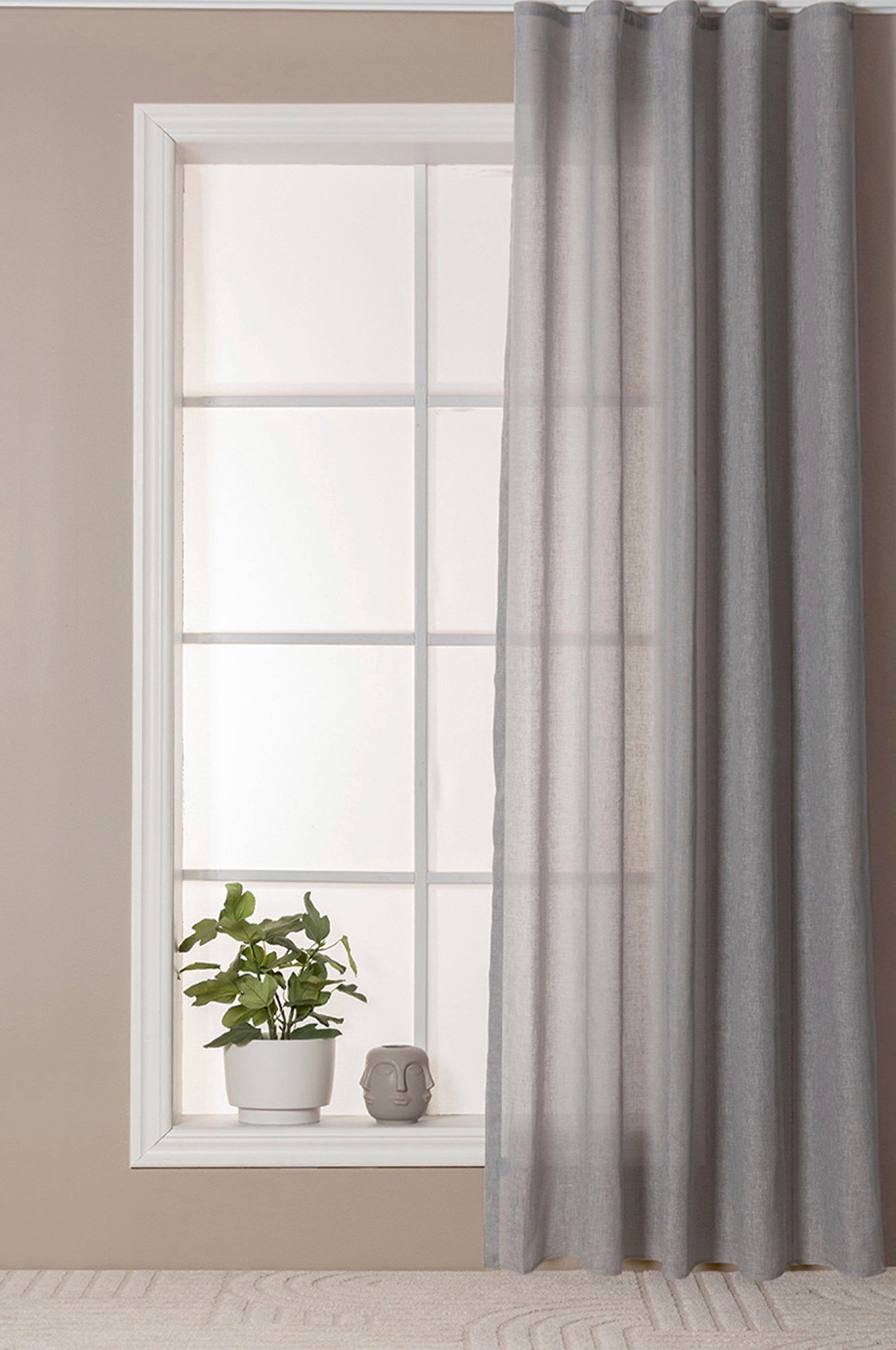 Skir gardin med linnestruktur. Gardinen har Hastas multigardinband och kan hängas upp på fyra sätt: wave (hotellkänsla), med fingerkrokar, med rynkbandskrokar eller direkt på stången med färdiga hällor. Gardinkrokar ingår inte. Observera att förpackningen innehåller en gardinlängd.