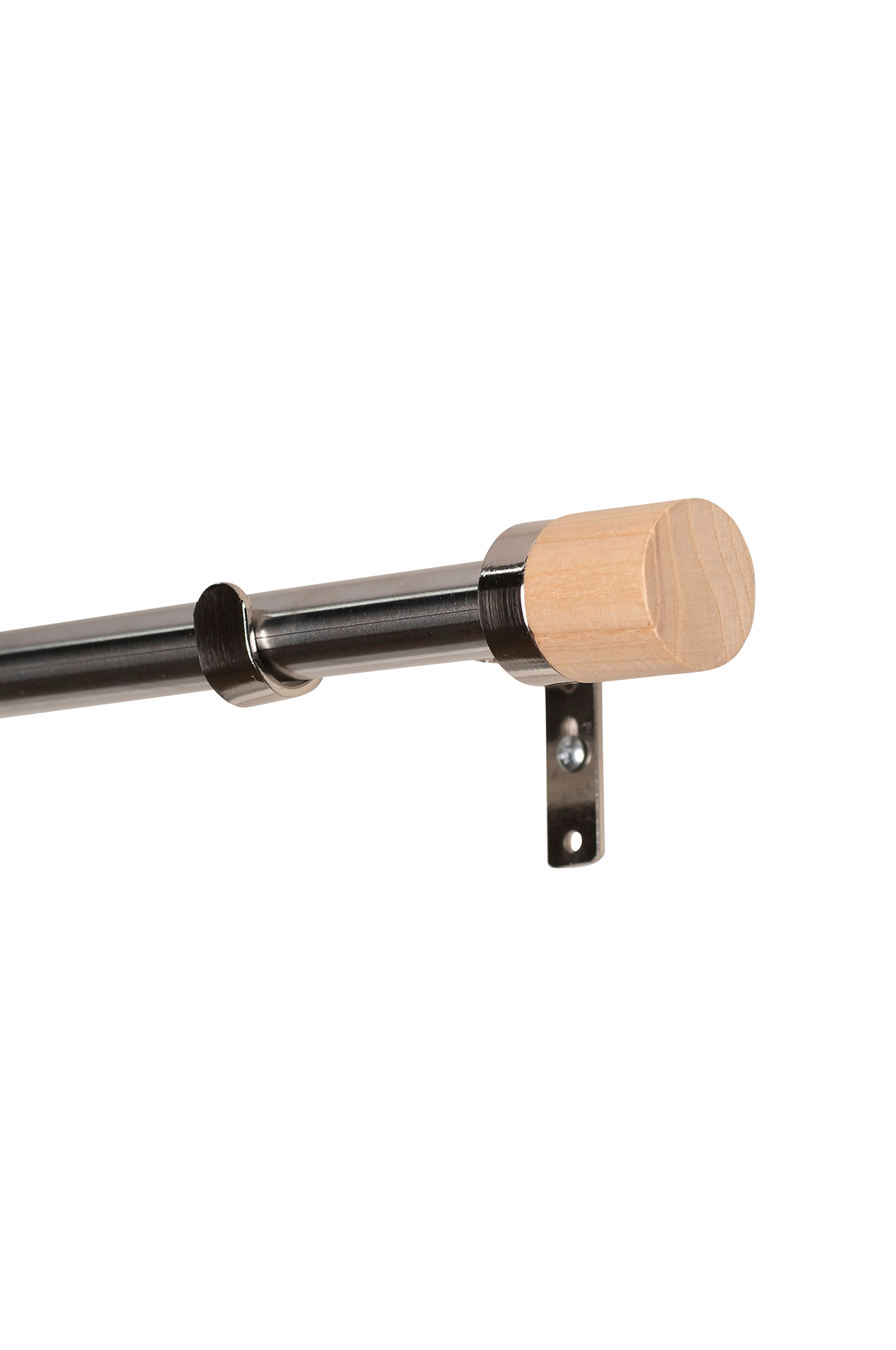 Komplett gardinstång i metall (16/19 mm) med dekorativa finialer i trä. Setet innehåller justerbara stänger (110-200 cm), 2 finials och 3 justerbara väggfästen (7-9 cm).