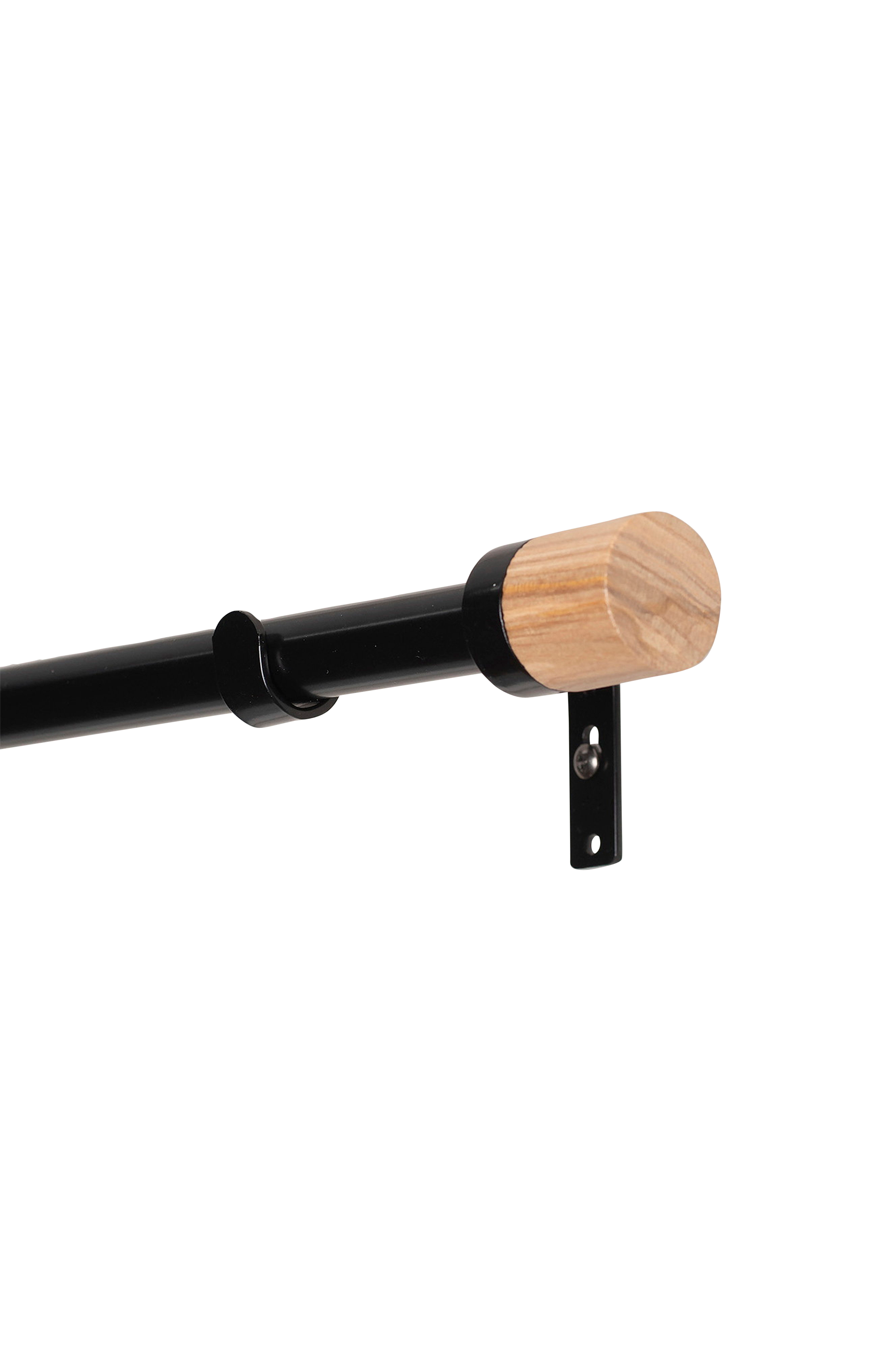 Komplett gardinstång i metall (16/19 mm) med dekorativa finialer i trä. Setet innehåller justerbara stänger (110-200 cm), 2 finials och 3 justerbara väggfästen (7-9 cm).