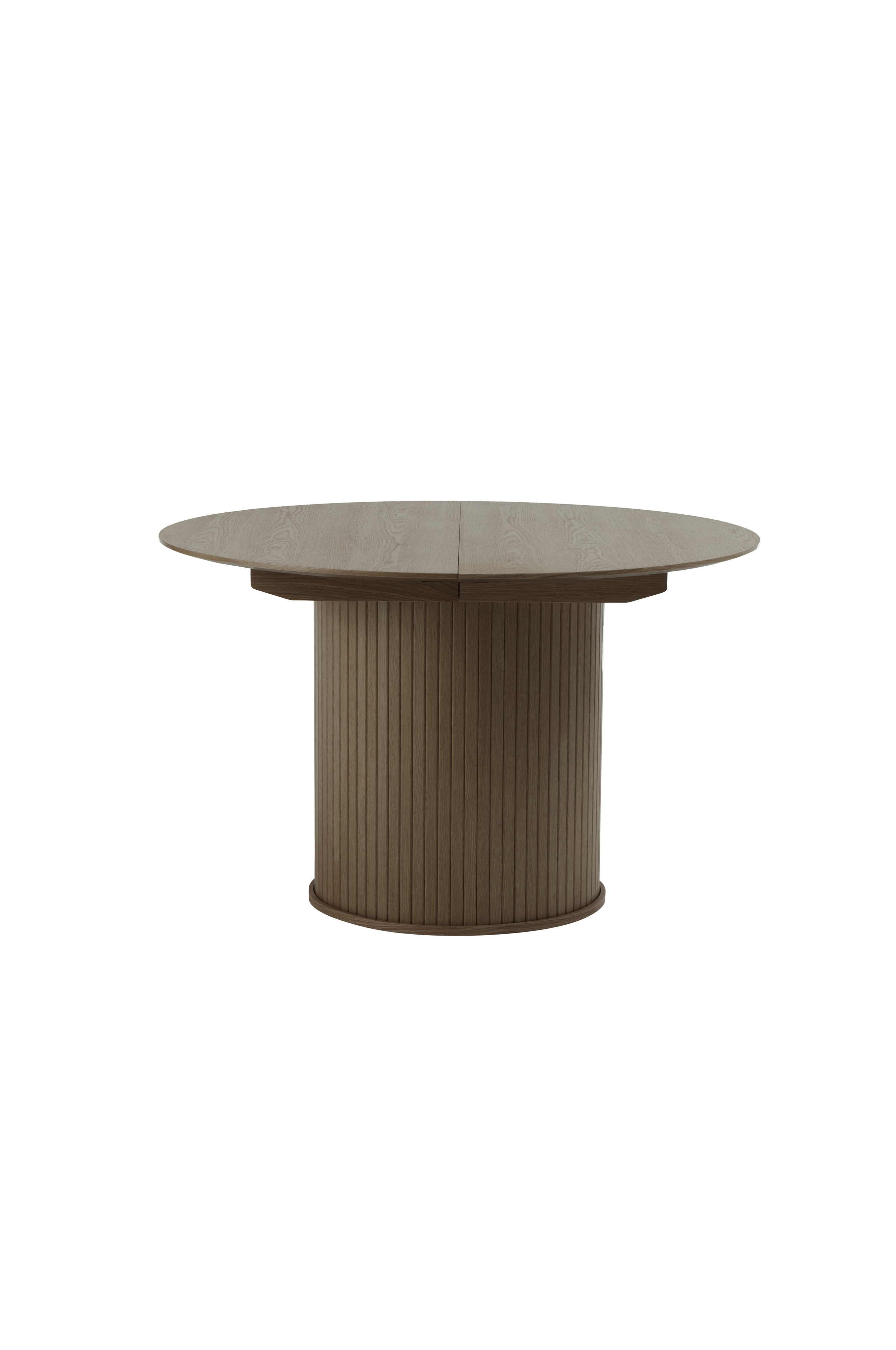 Det här matbordet har en rund bordsskiva på ø120 cm som kan förlängas till 167 cm med de två medföljande iläggsskivorna, vilket gör det perfekt för både vardagsmiddagar och större sammankomster. Det räfflade cylindriska underredet ger modern charm och ett stadigt stöd.