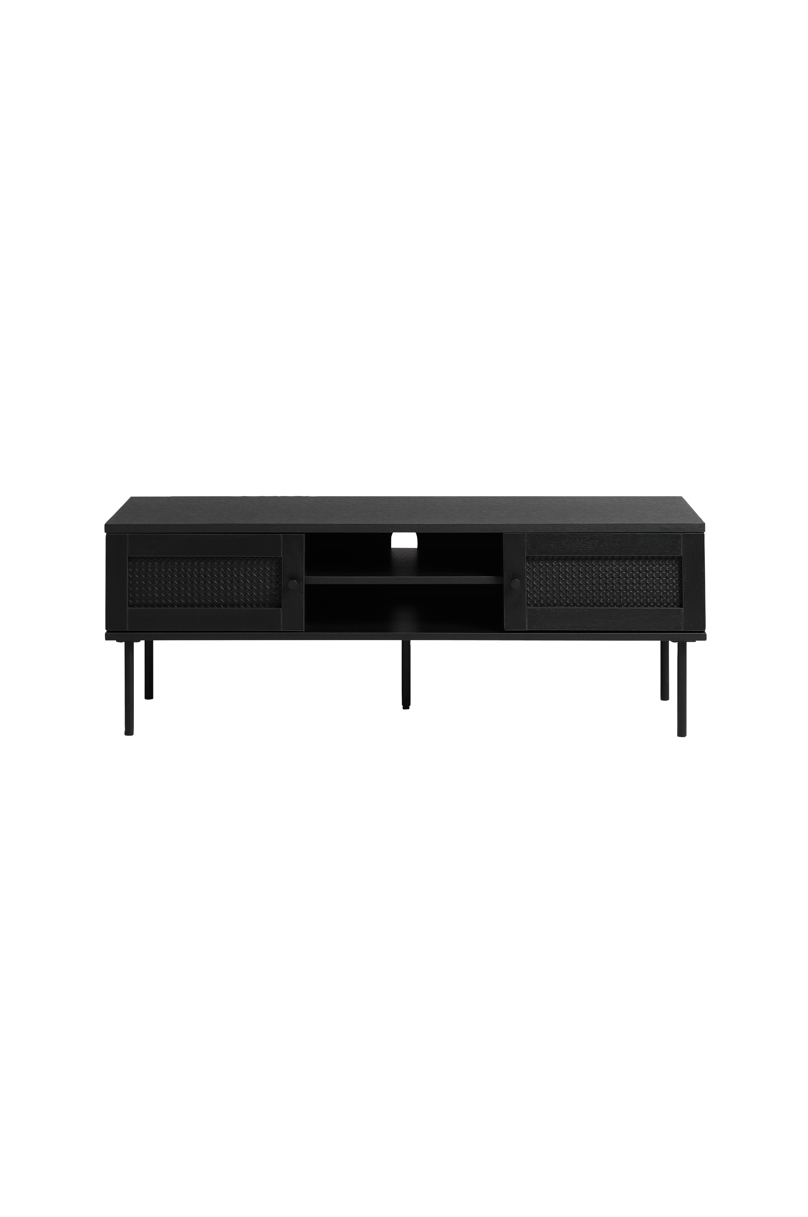 Härlig tv-bänk i svart, i lite retrostil. Bra höjd och bredd (så att du inte behöver se upp för att titta på tv), rymmer mycket i skåpen, även om de inte är stora, gott om plats…