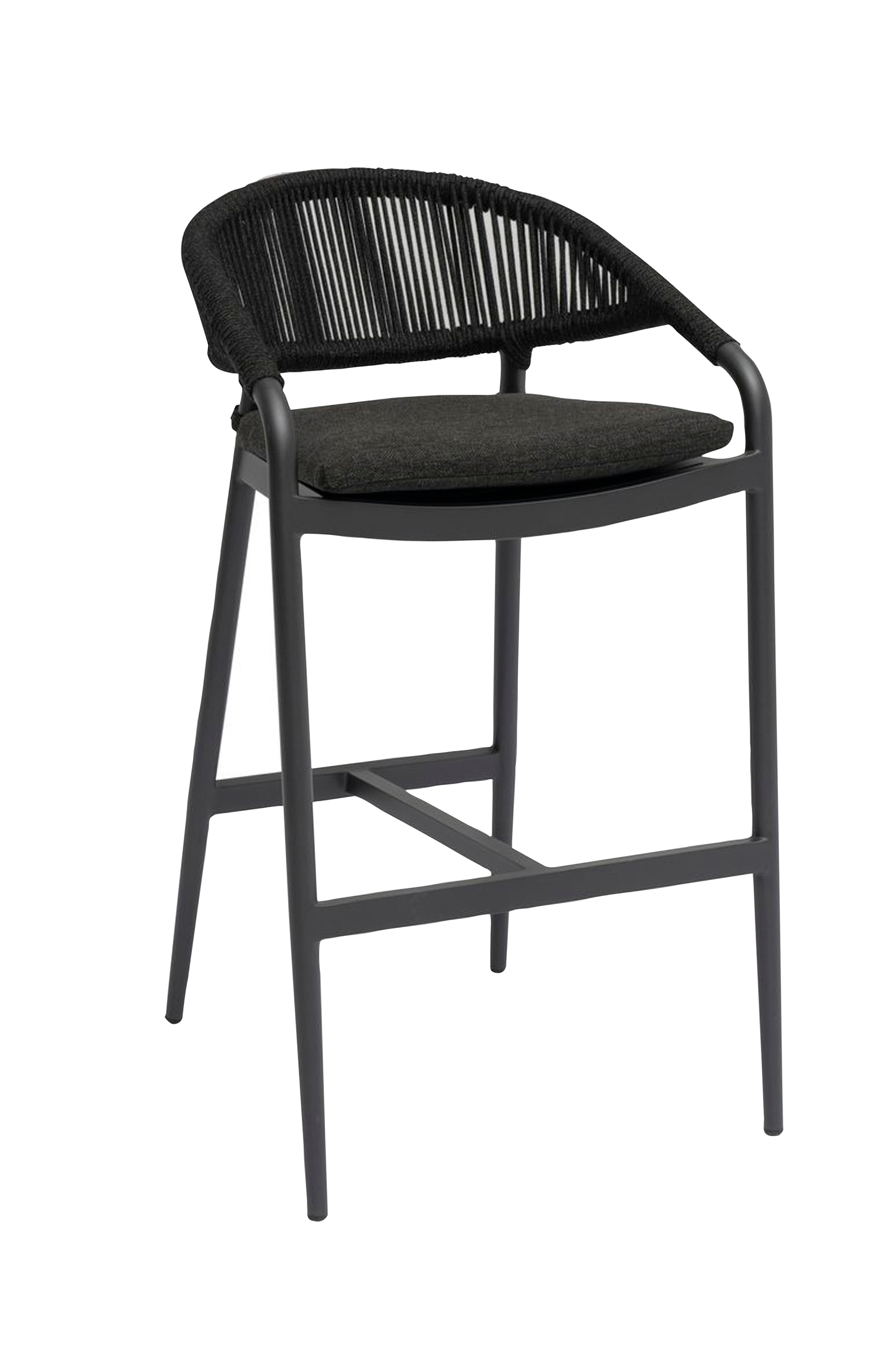 En bekväm, modern och underhållsfri stol. Stolen är stapelbar. Tillverkad av aluminium flätad med akrylrep och sits klädd i textil. Svart dyna med quickdry-skum i sitsen. Quickdry är ett unikt fyllnadsmaterial med snabbtorkande förmåga och god sittkomfort. Det andas, har en öppen cellstruktur och är väderbeständigt och fungerar därför optimalt för utemöbler.