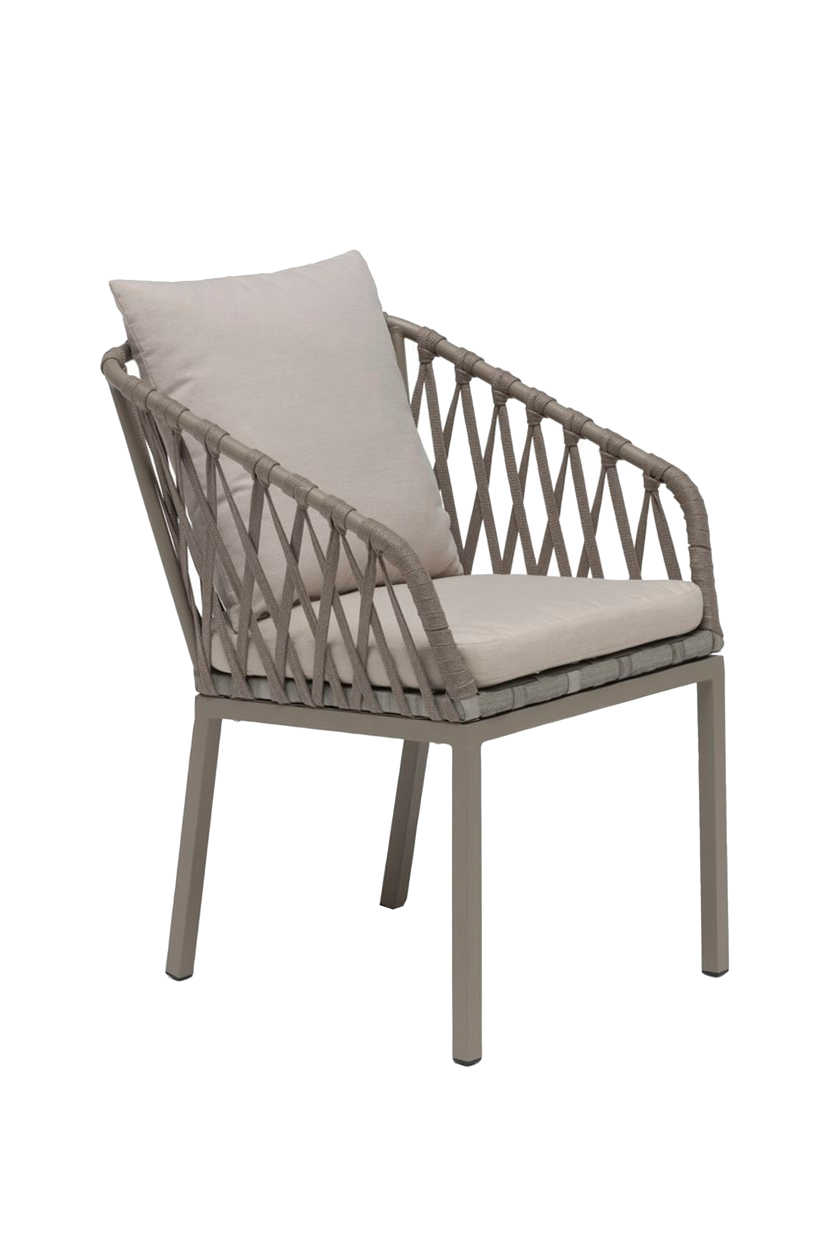 En modern och elegant matstol i Jet Set-serien. Matstolen är tillverkad av beige aluminium och beige flätade ränder av uv-tyg. Serien är designad av karl malmvall. 2 st.