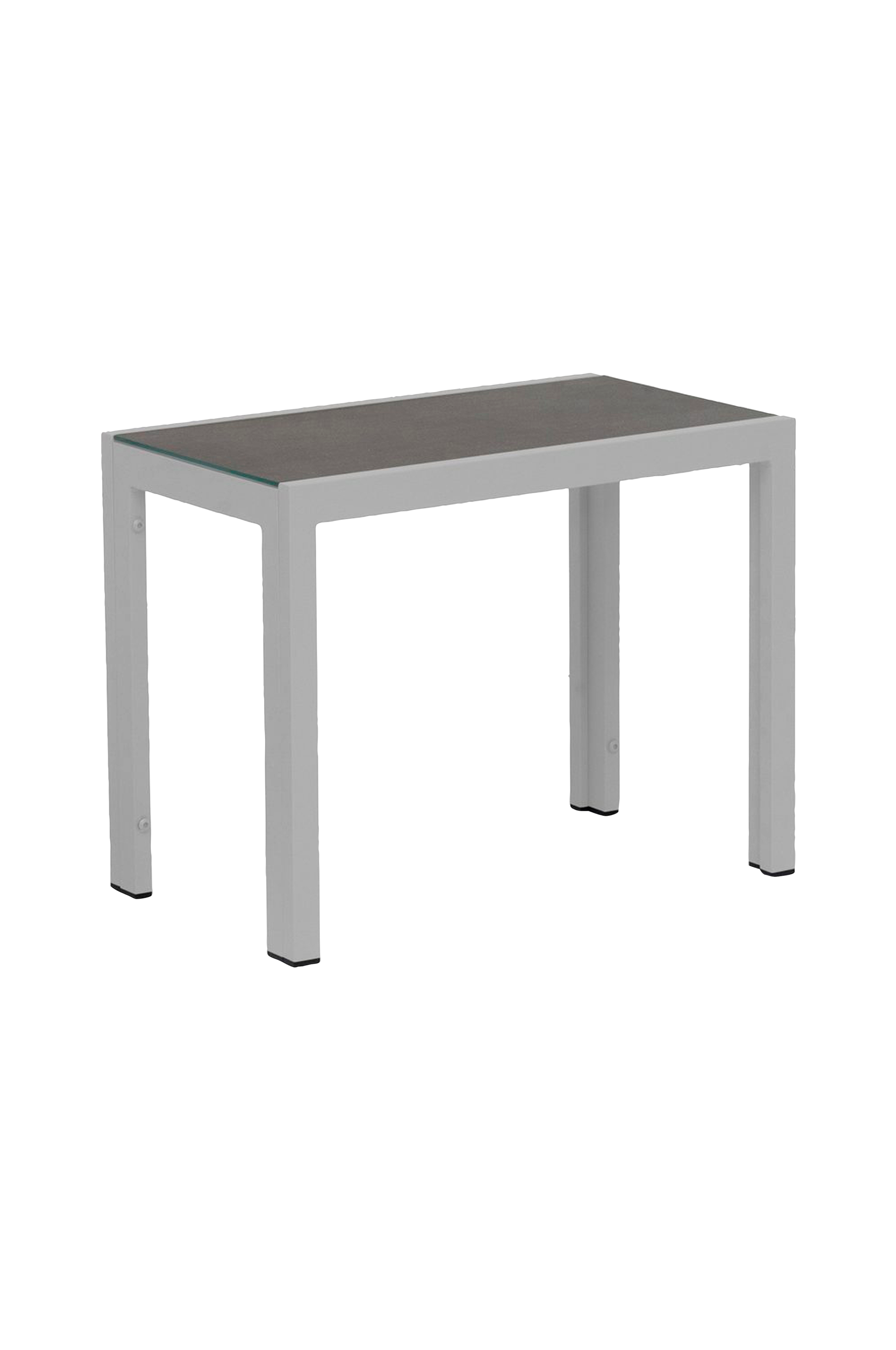 Ett elegant och underhållsfritt sidobord i aluminium med en bordsskiva i varmgråmarmorerat keramiskt glas, 5 mm tjock
