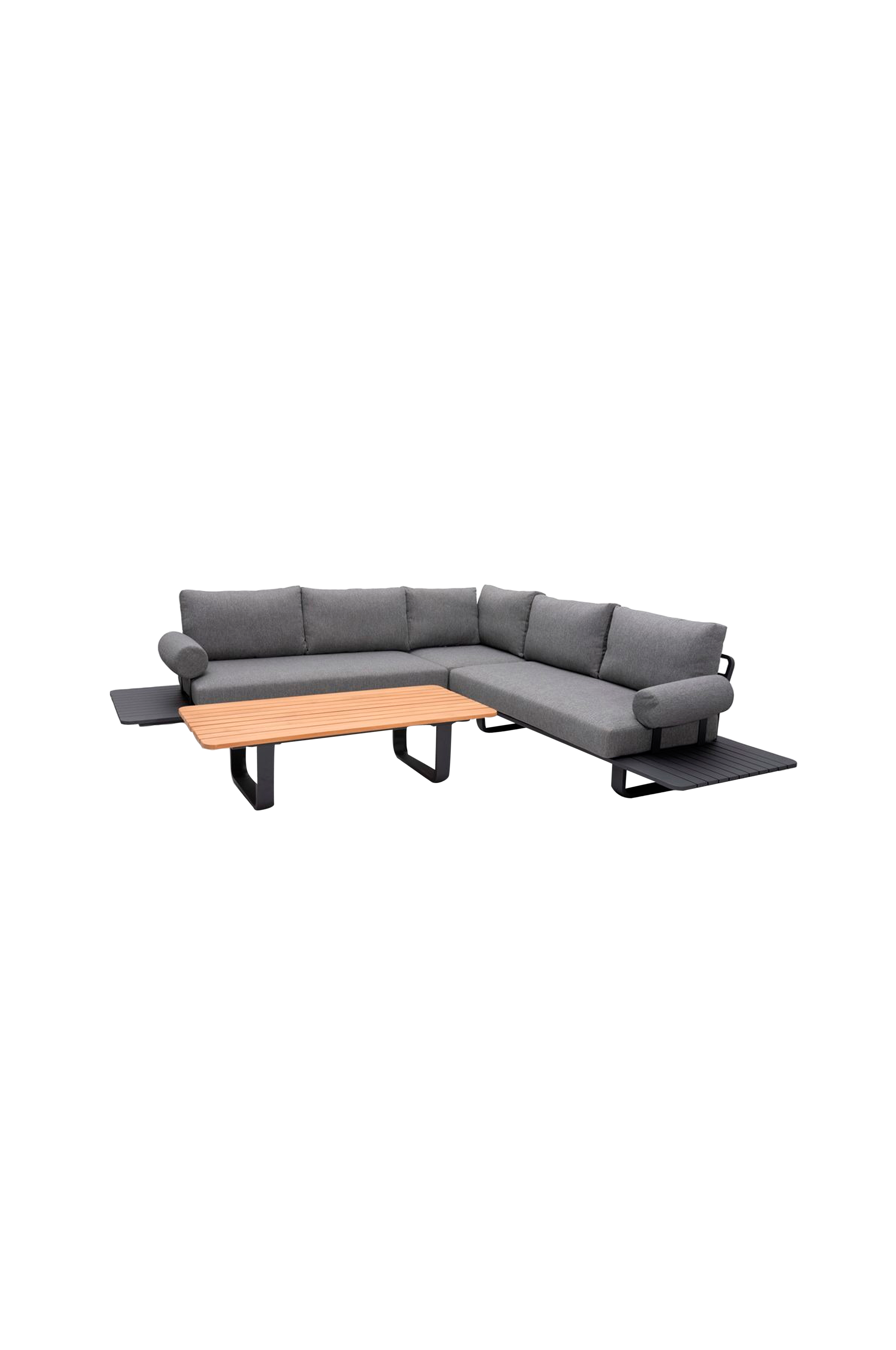 En modern möbelgrupp för större sällskap. Soffan har praktiska avlastningsytor i samma räfflade design som bordet. Tillverkad av aluminium. Färg: charcoal. Bordsskiva i fsc-certifierad teak. Grå dyna i olefin med quickdry-skum i sitsen. Quickdry är ett unikt skum med snabbtorkande förmåga och hög komfort. Quickdry andas, har en öppen cellstruktur och är väderbeständigt. Därför fungerar det optimalt för utemöbler. De rundade dynorna i ytterkanterna kan också användas som kudde. Dimensions: table 140x67x37 cm
