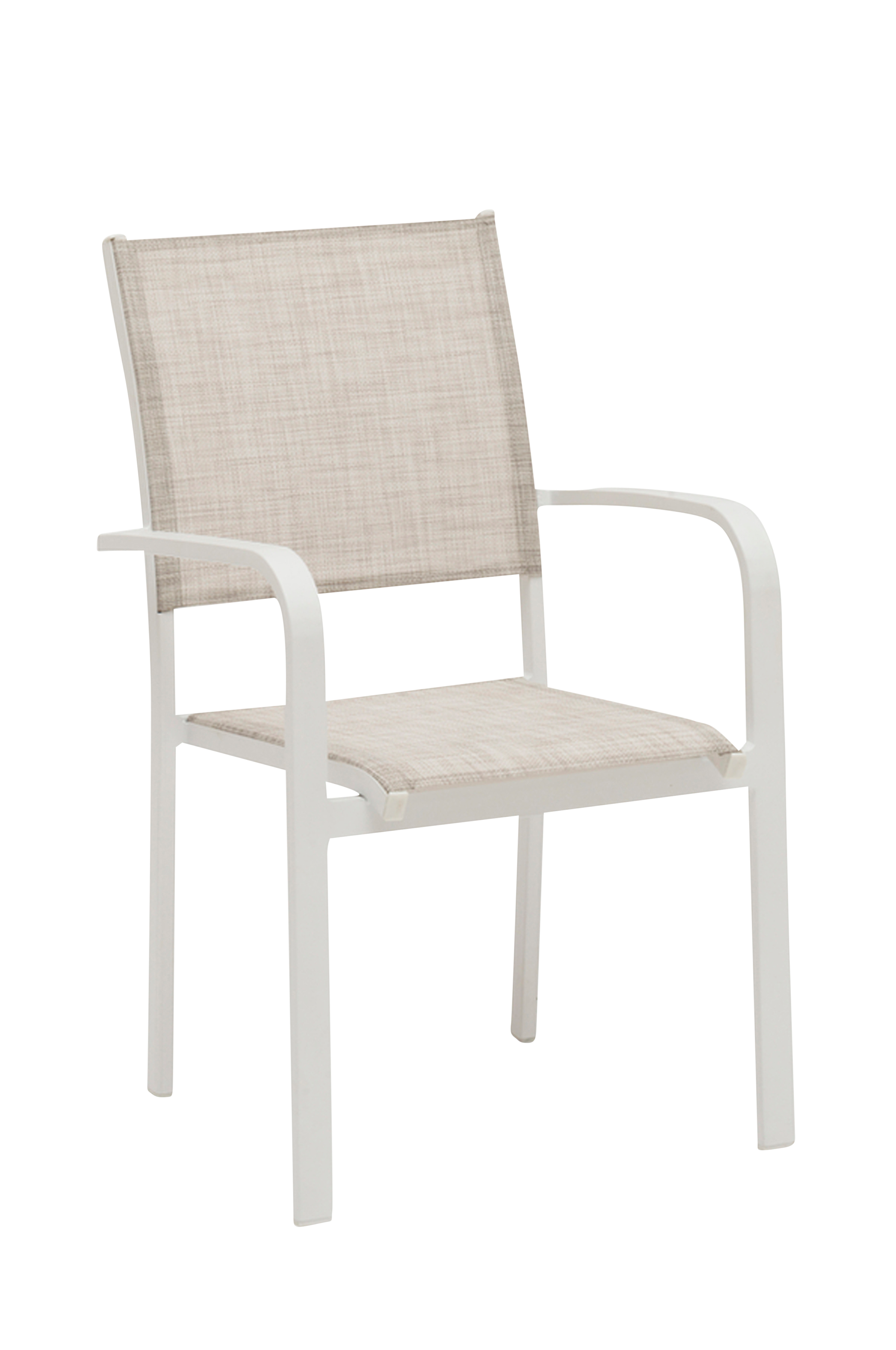 Stapelstol med stomme i vit aluminium. Sits och rygg i gråbeige textilene.