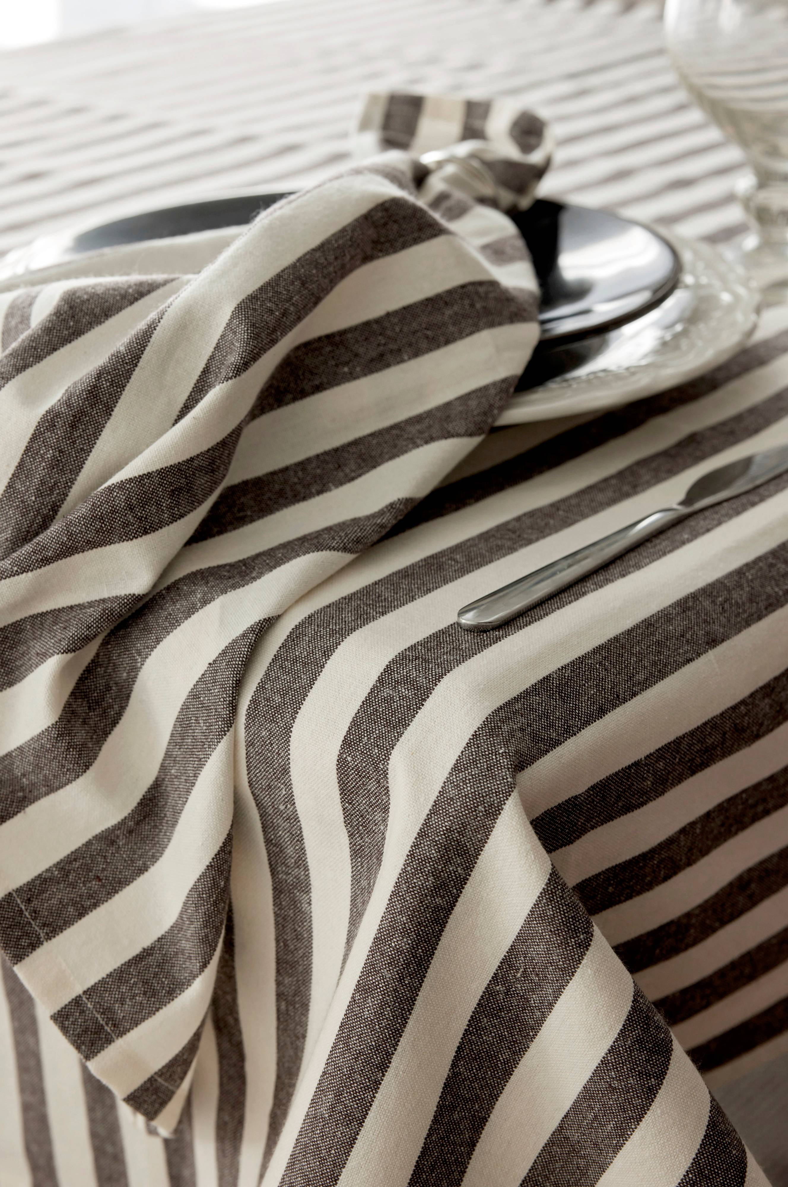Bretagne är en kollektion i en återvunnen bomullsmix, med tydliga blockränder i olika färger. Väven är tillverkad av 100% återvunnet, grs-certifierat garn. Sammansättningen är 80% bomull, 20% andra fibrer. Servetten tvättas efter sömnad, vilket ger ett avslappnat uttryck och en mjuk känsla. Säljs i 4-pack. Maskintvätt 60°c