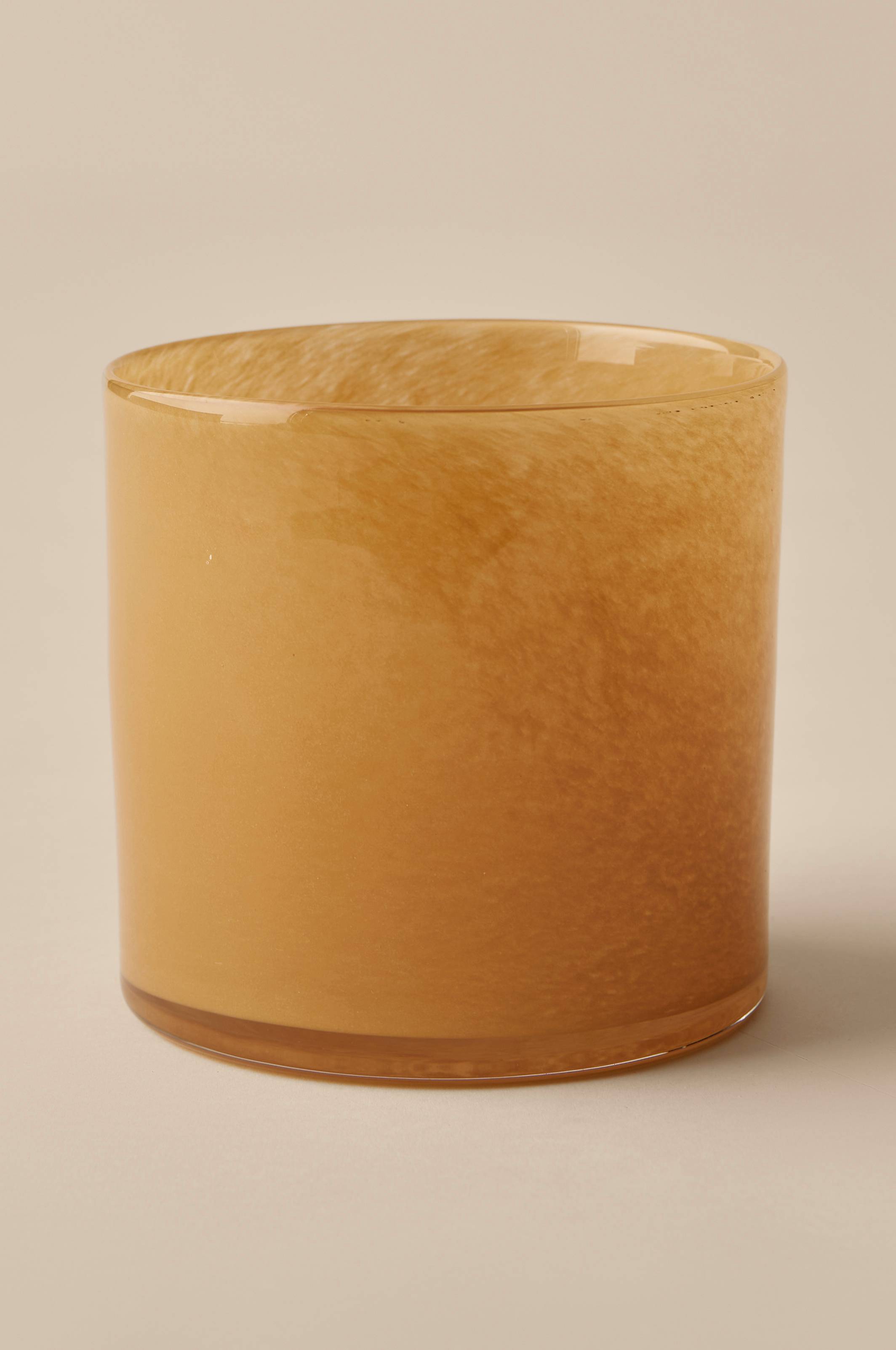 Ljuslykta eller liten kruka i glas. Färgen har vackra skiftningar och glaset har bubblor i sig som skapar fint uttryck och ett stämningsfullt ljussken. Tekniken gör att ojämnheter och färgskillnader förekommer och varje ljuslykta blir unik. Höjd ca 15 cm, Ø ca 15 cm. Rengörs för hand.
