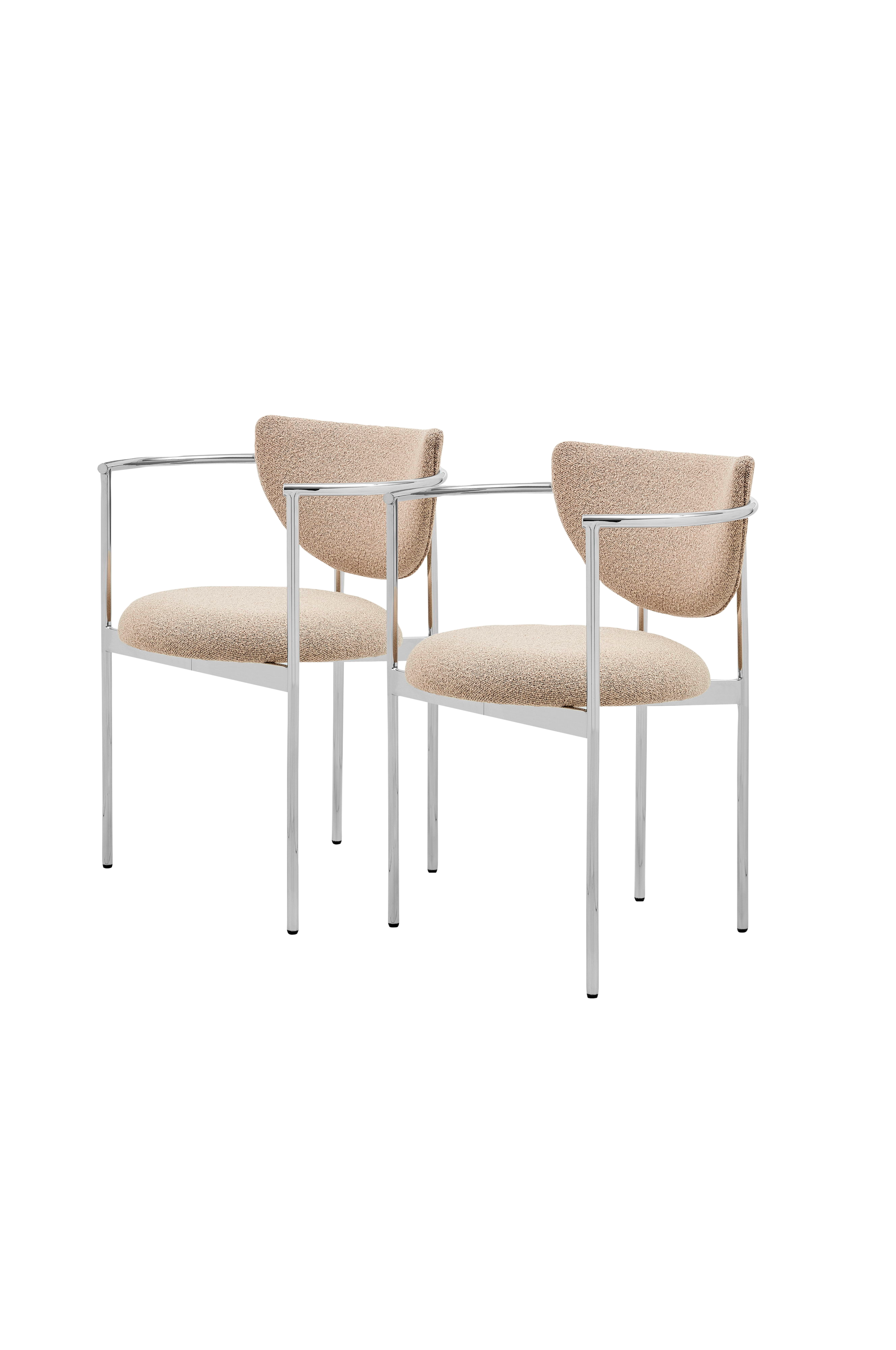 Stolen har en svart metallram, inklusive böjda armstöd och smala ben, vilket ger en touch av modern elegans. Den texturerade tygklädseln kompletterar de rena linjerna, vilket gör den idealisk som både matstol och accentstol.