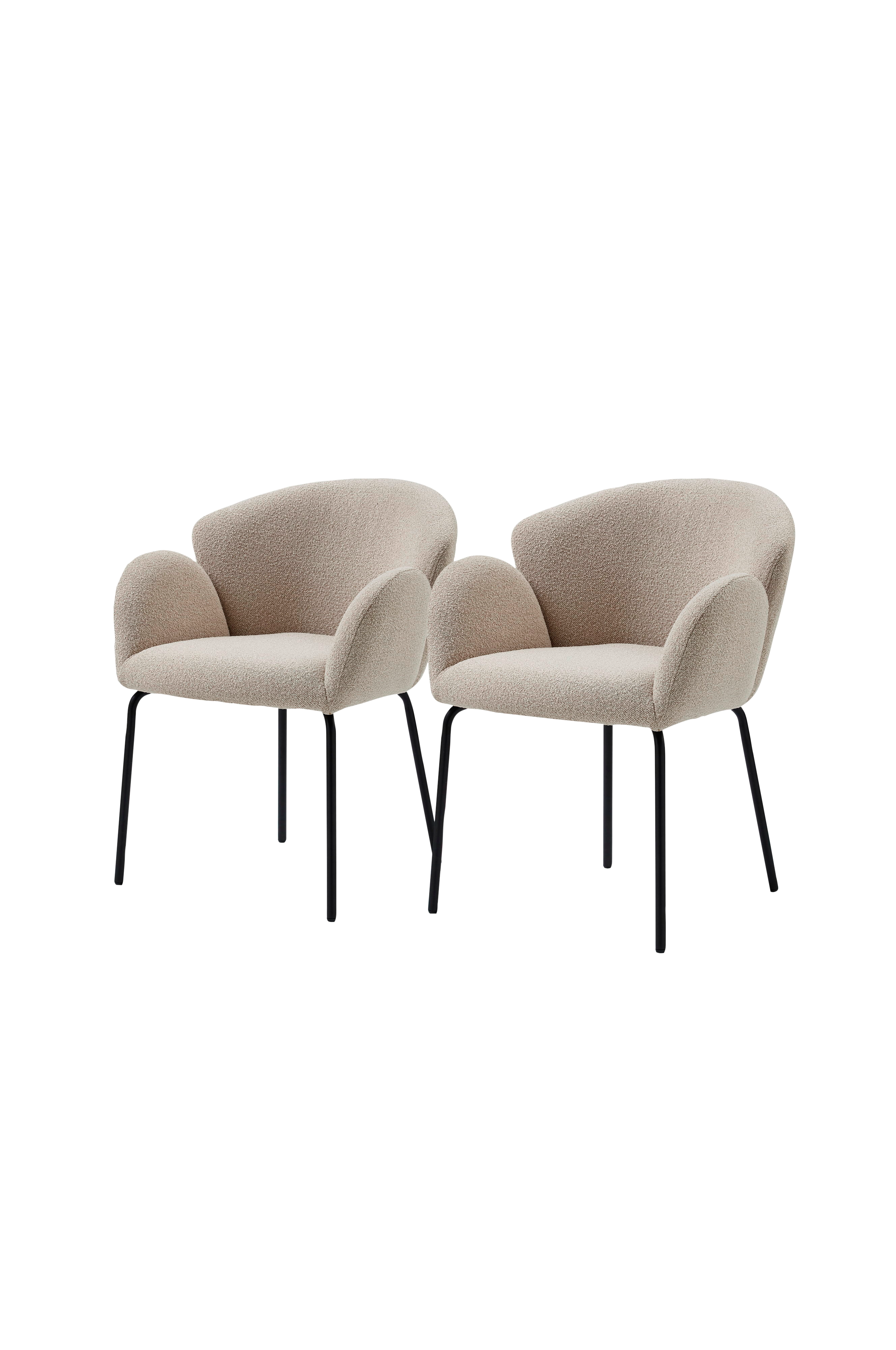 Stolen har smala ben i svart metall som ger en touch av modern elegans. Den mjuka, texturerade klädseln kompletterar den böjda silhuetten och skapar en harmonisk balans mellan stil och komfort.