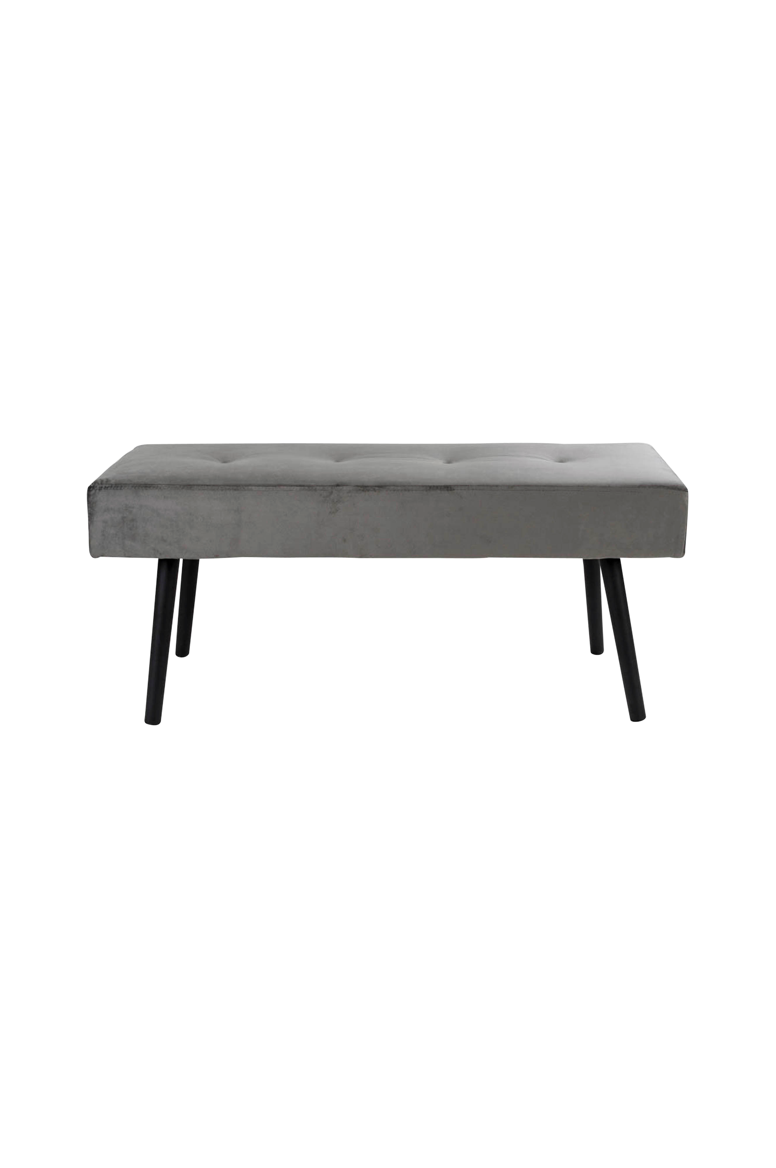 Bänk i sammet med stålben. Mått: Längd: 35 cm. Bredd: 100 cm Höjd: 44 cm. Material: Sammet och stål. Ej monterad. Maxvikt 110 kg.