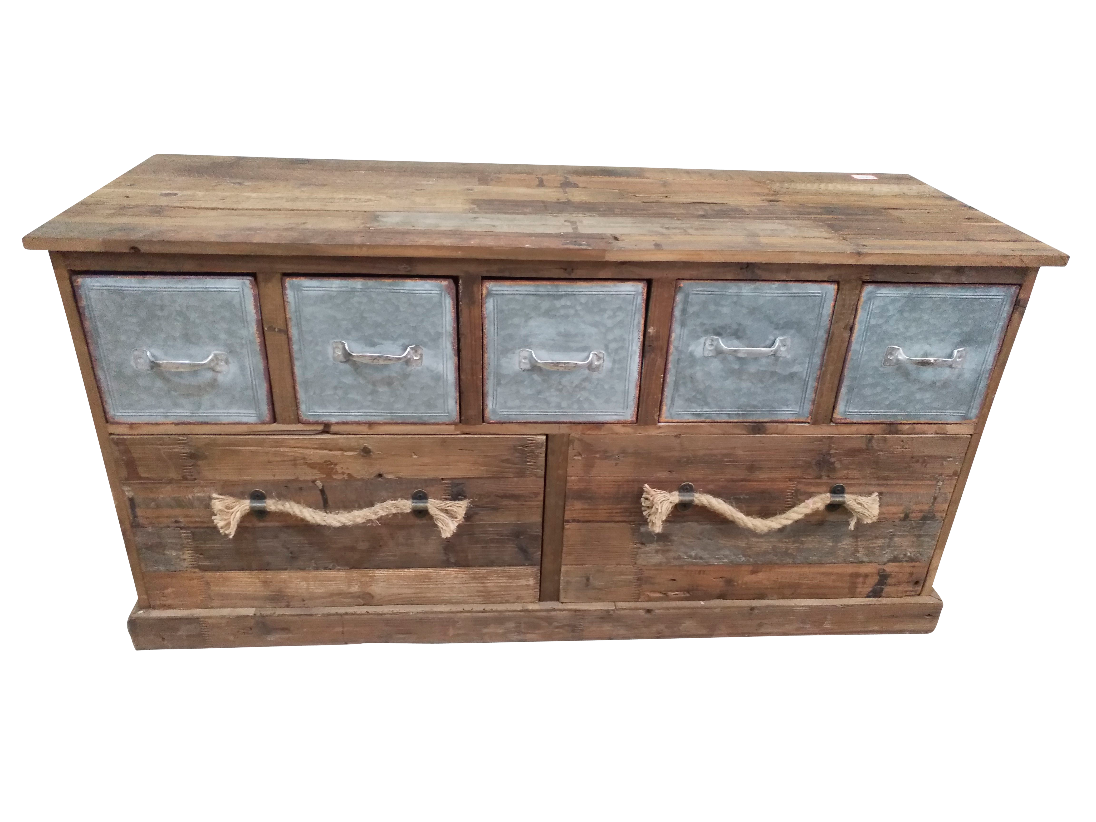 Aspen bänk/ Tv bänk passar för många ändamål, denna produkt är i återvunnet trä som kommer från gamla nermonterade hus, vilket gör att varje enhet har sin egen prägel. Till detta finns det 5 lådor i galvad plåt, samt 2 lådor i trä med rep handtag. denna produkt kommer monterad.