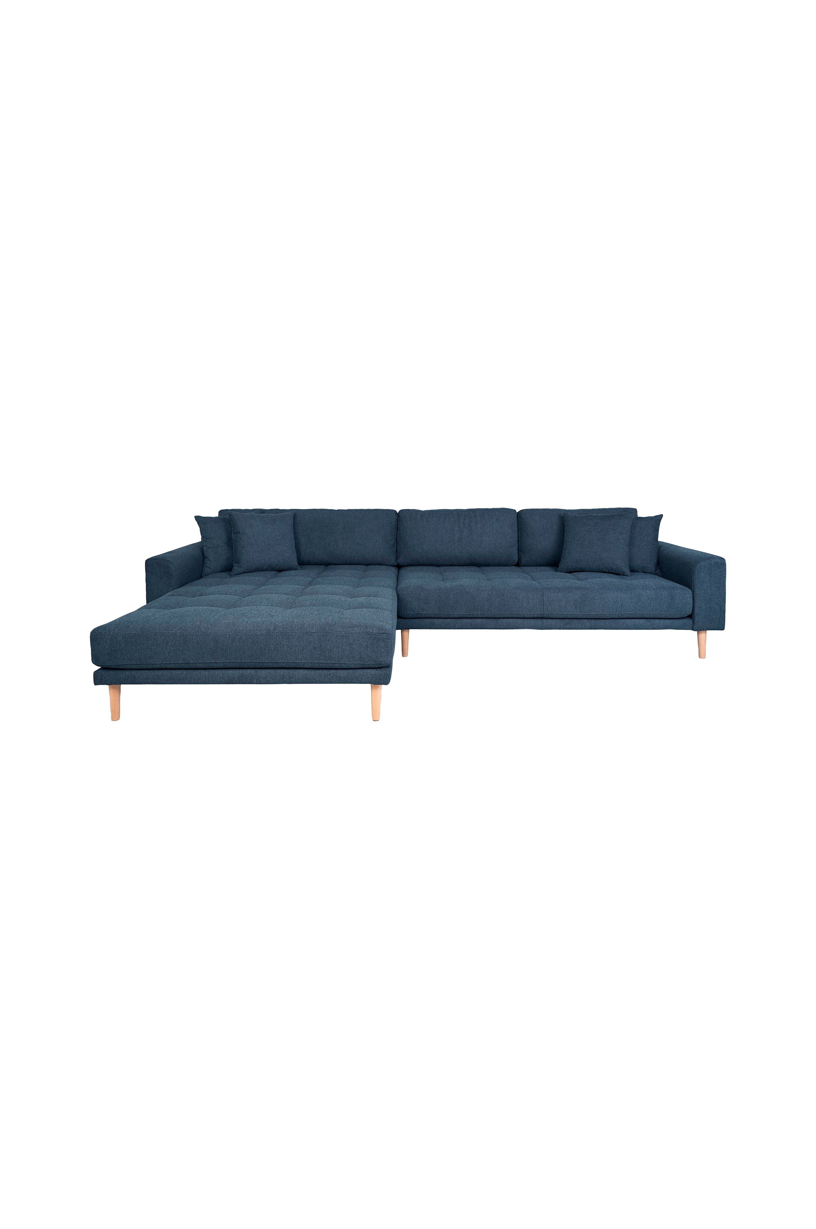 Loungesoffa i vänstermodell med fyra kuddar and ben av naturfärgat trä