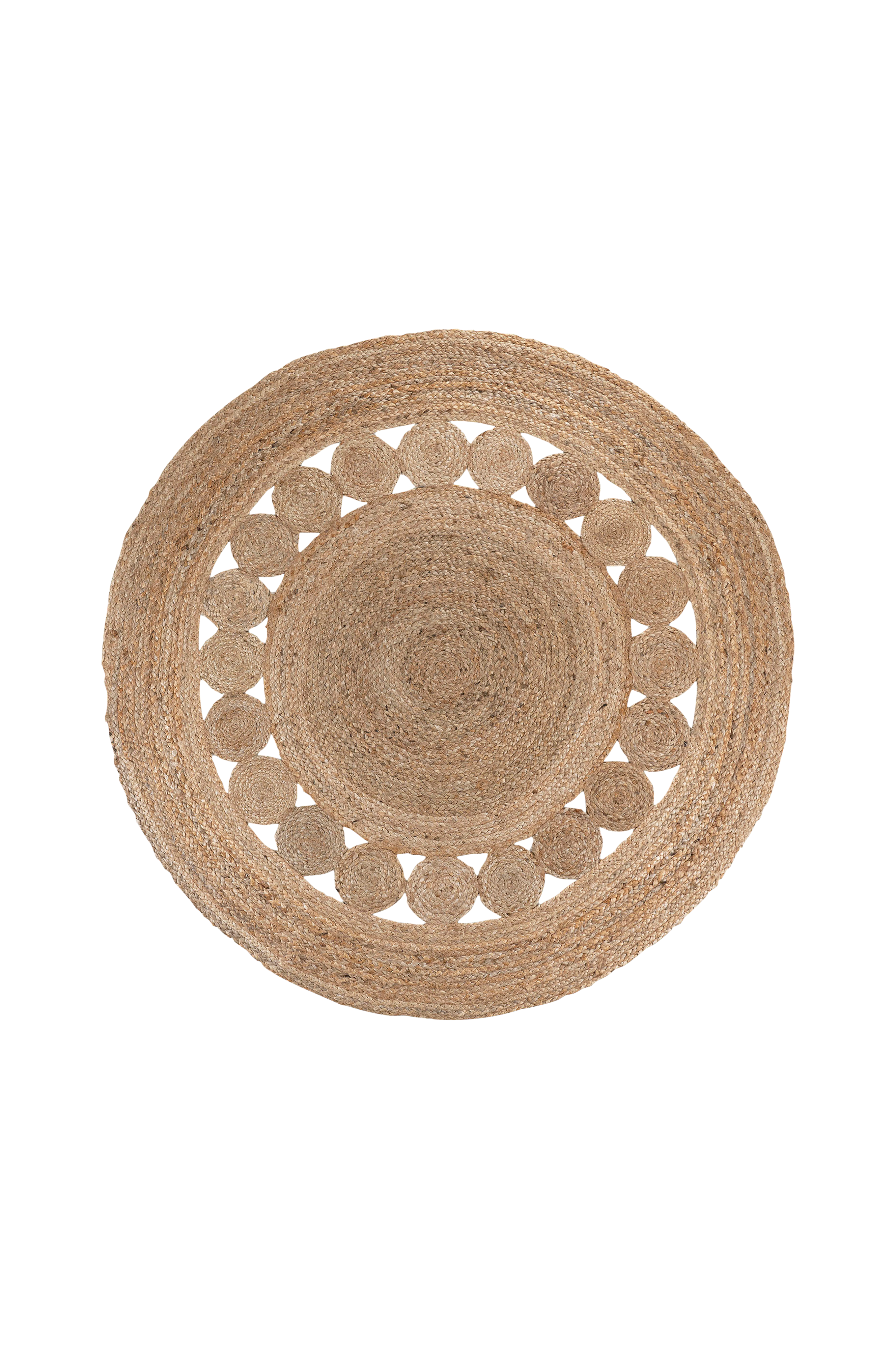 Rund matta av flätad jute i naturfärg med mönster