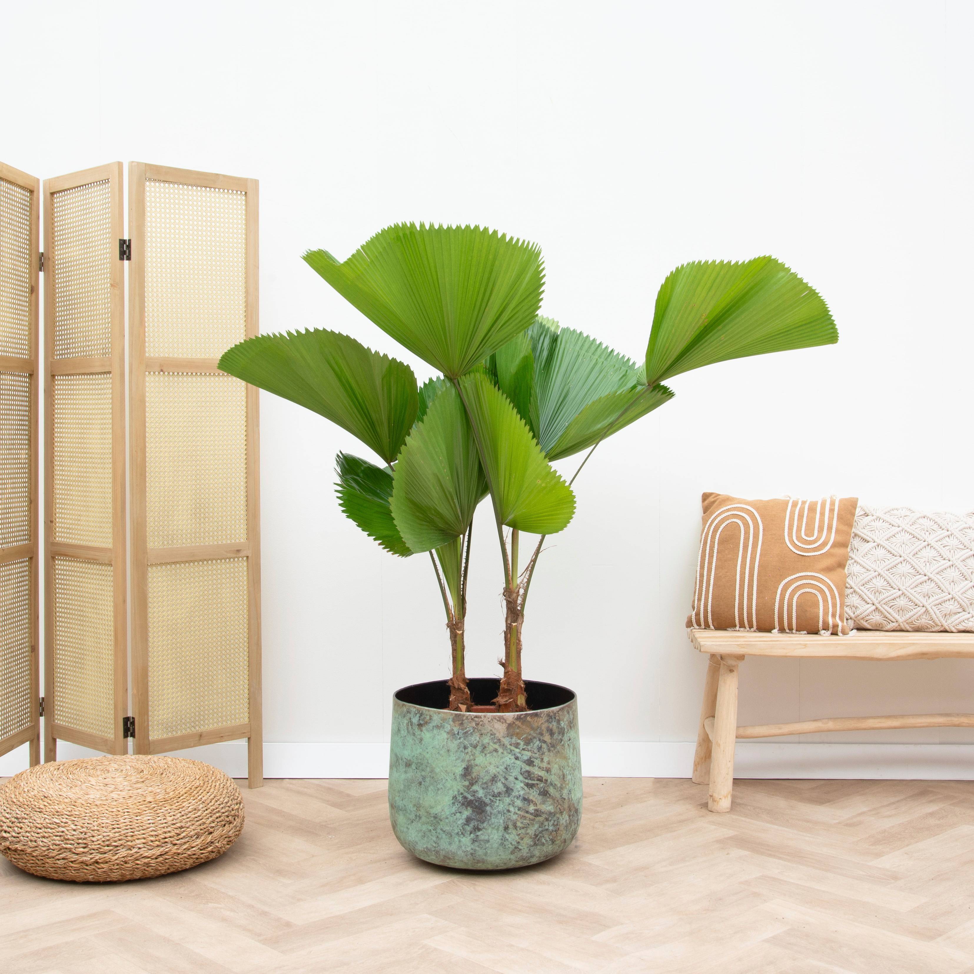 Licuala grandis, även känd som fan palm, kommer ursprungligen från tropikerna i sydostasien och norra australien. Växten kännetecknas av sina solfjäderformade blad och luftrenande effekt. Denna ståtliga palm är ganska törstig och mår bäst i normalt dagsljus utan direkt solljus. Höjd 170 cm. Krukdiameter 40 cm. Ytterkruka ingår ej. Doft: ingen.
