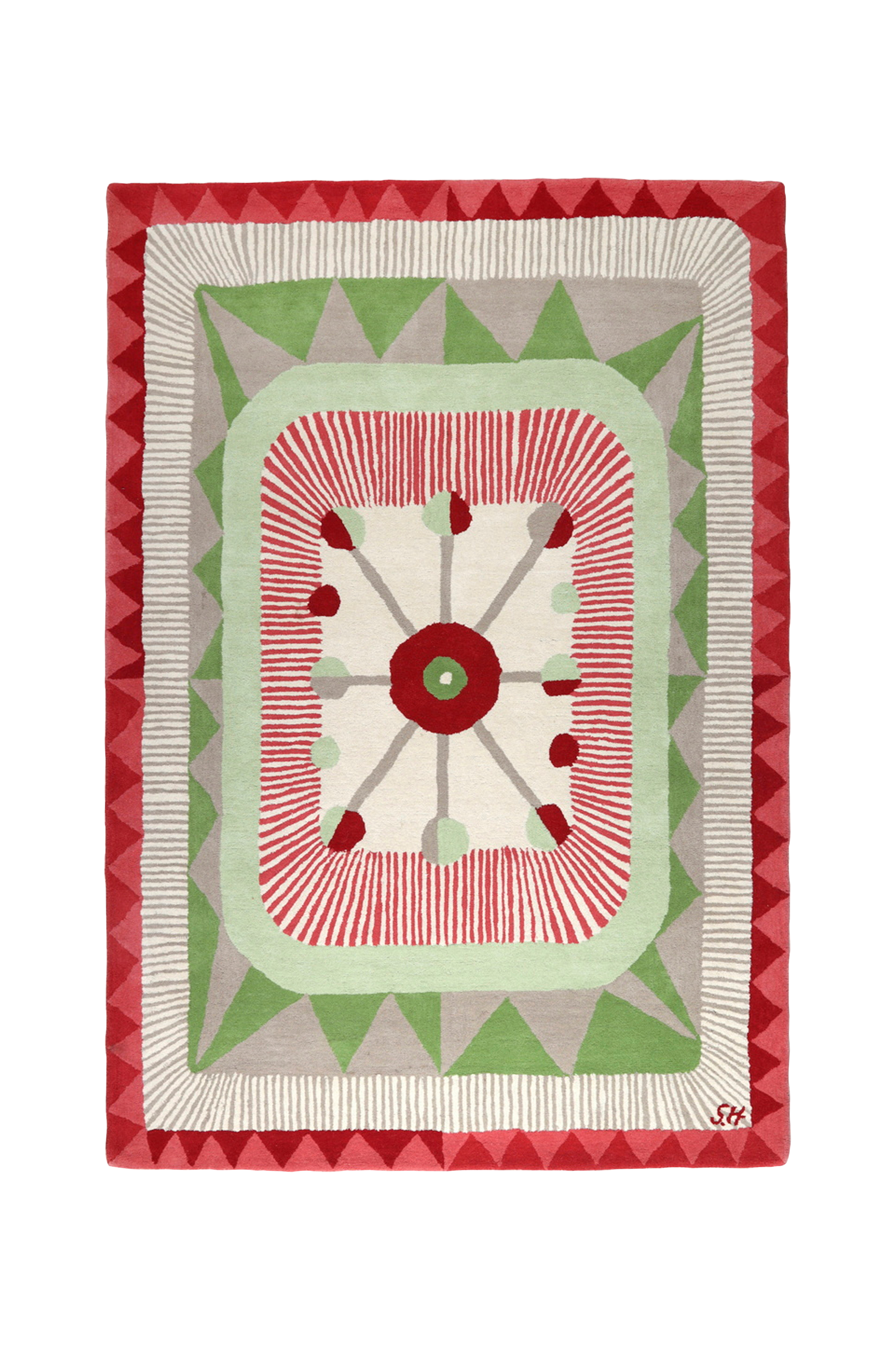 Zigzag är en mönstrad ullmatta designad av formgivaren stina hagström. Mattan är handtuftad och har en tjock och tät lugg av ull med en baksida av bomull för ökad stabilitet. Mönstret är livfullt med sicksack, linjer och runda former.