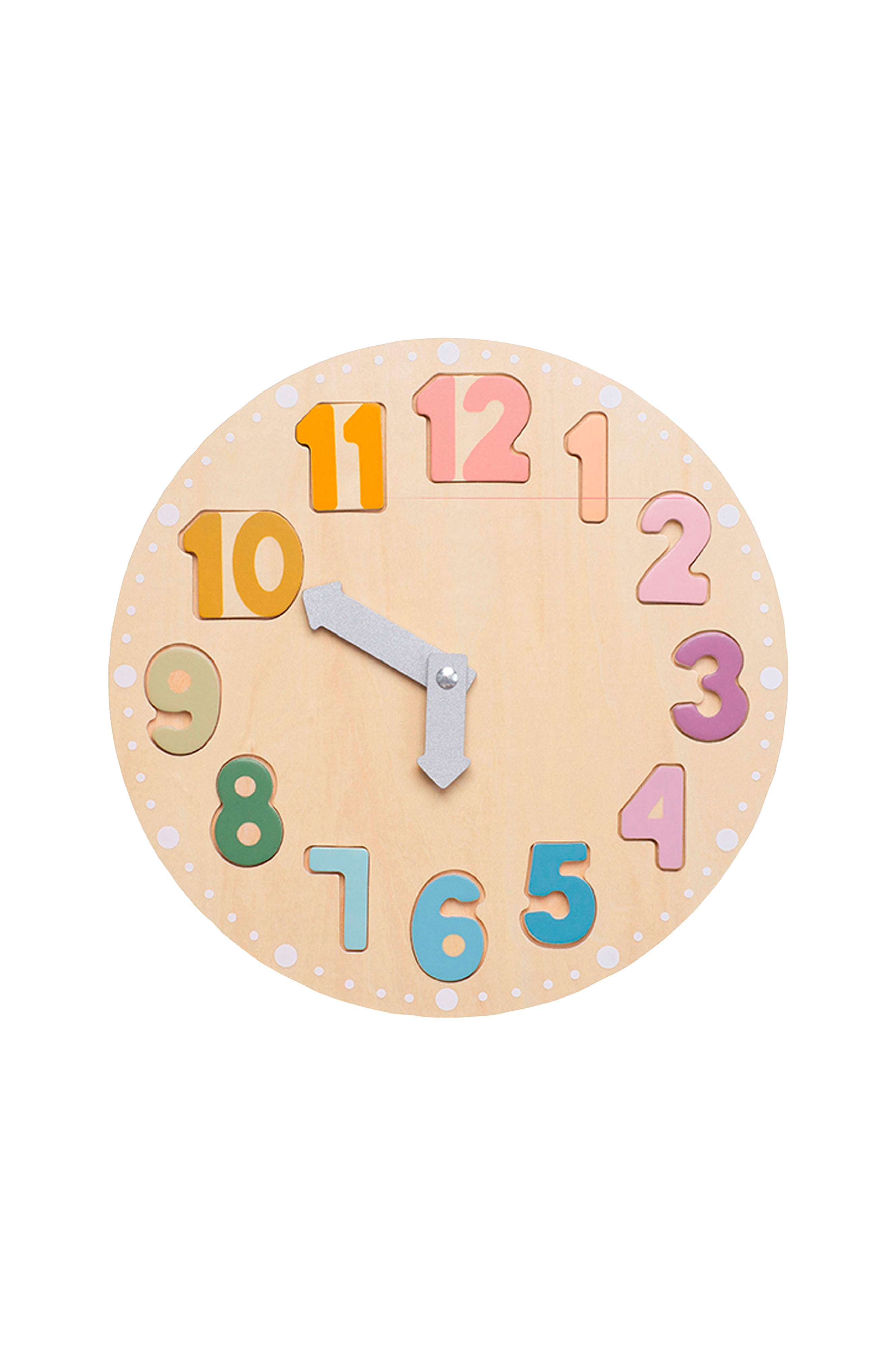 Pusselklocka i trä med flyttbara visare där siffrorna är lösa pusselbitar.