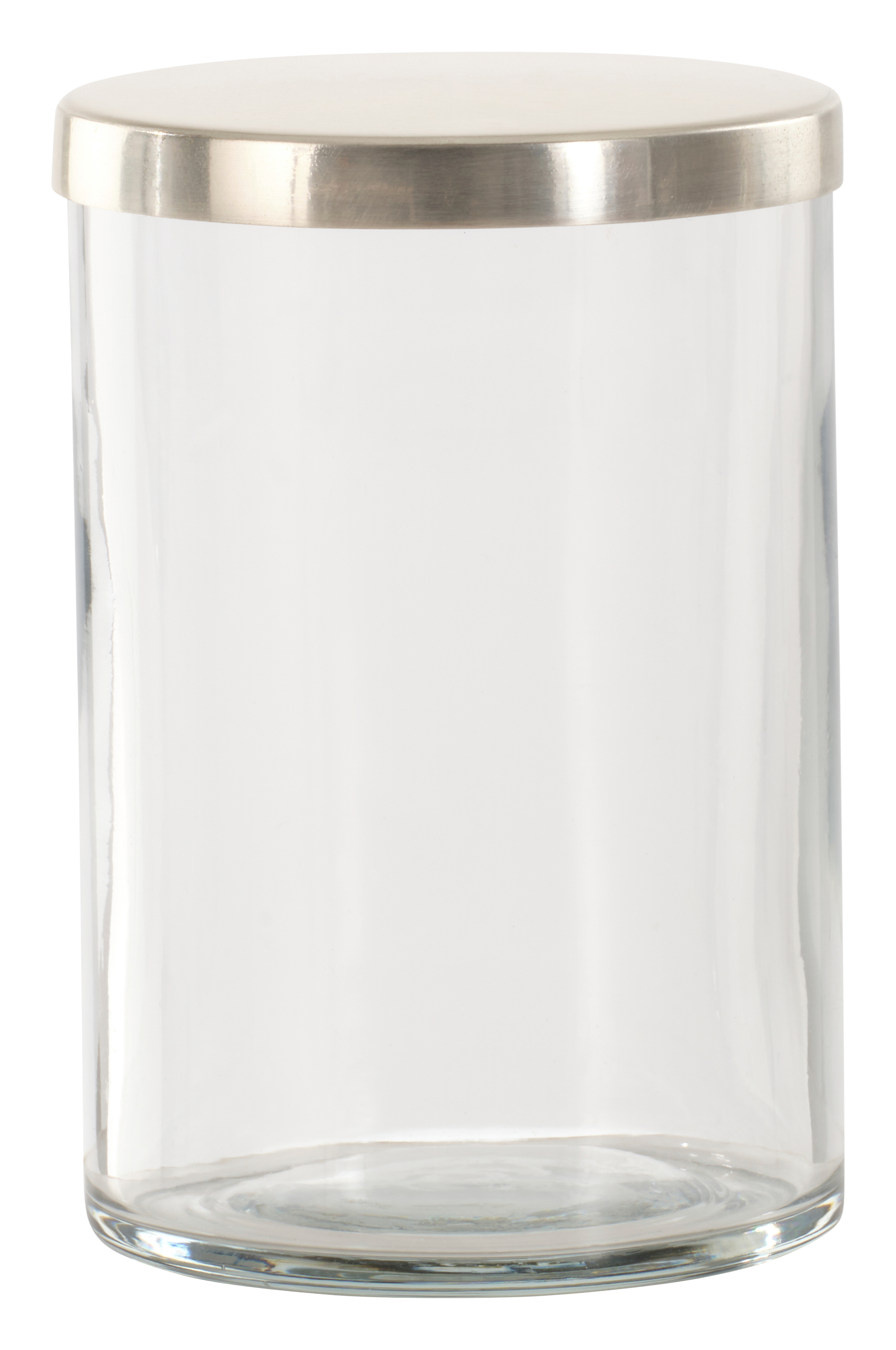 En burk med lock i rostfritt stål och glasbehållare, perfekt för att organisera badrumsartiklar som bomullstussar, tops eller badsalt. Den ger en modern touch till din inredning.