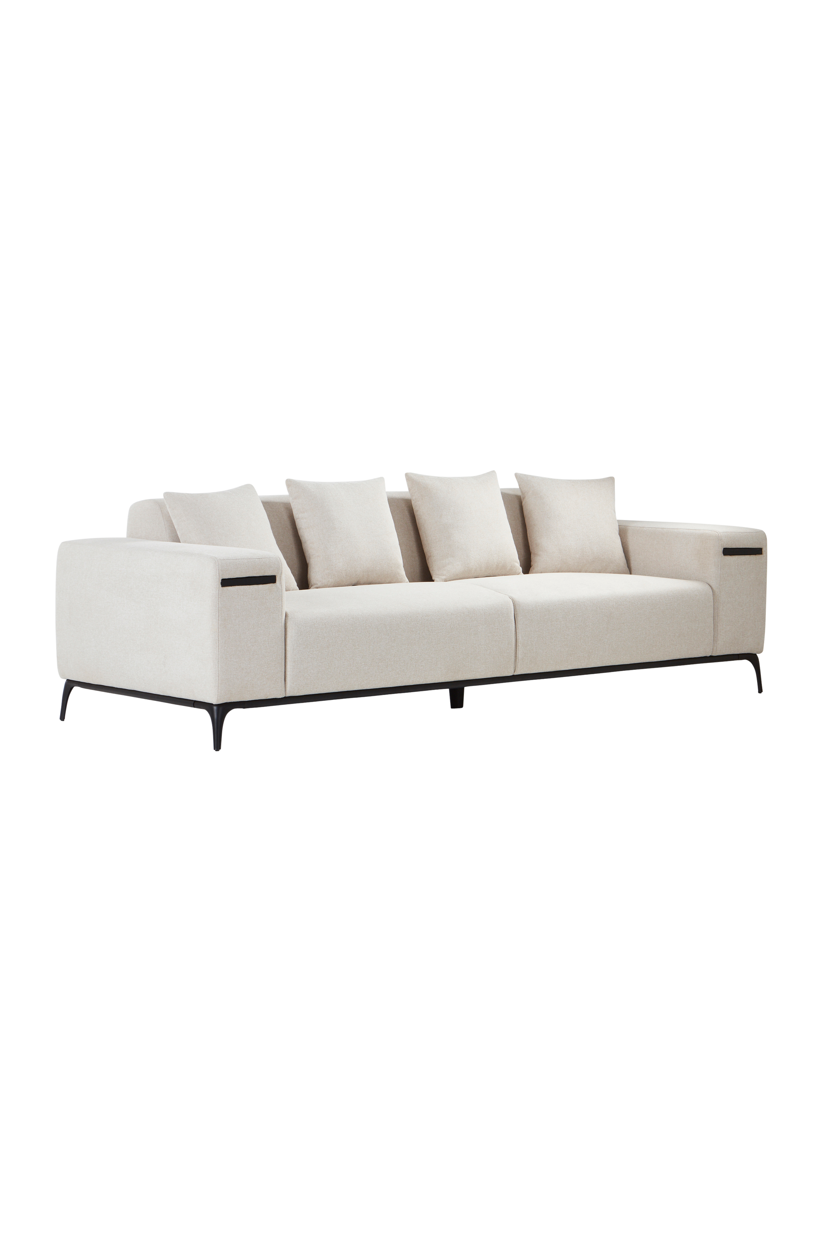 AROSA är en pampig och bekväm 3-sits soffa med små bord dolda i armstöden, som skjuts fram med ett klick. En härlig finess som ger soffan den rätta känslan när det är dags för filmkväll. På borden ryms både popcornskål och fjärrkontroll och i soffan sitter du bekvämt med vänner. AROSA 3-sits soffa har breda armstöd och fyra lösa ryggkuddar. Soffan har stabil stomme av furuträ som klätts med polyetylenskum som gör soffan skön att sitta i. De snyggt svängda ben är i stål med matt pulverlack. Soffan har klädsel av 95% polyester och 5% polyamid med fin struktur. Klädsen är ej avtagbar eller tvättbar. De små borden är av MDF med målad valnötsfaner. Maxvikt avlastningsbord: 5 kg. Skruvar medföljer. Viss montering krävs. Monteringsanvisning medföljer.