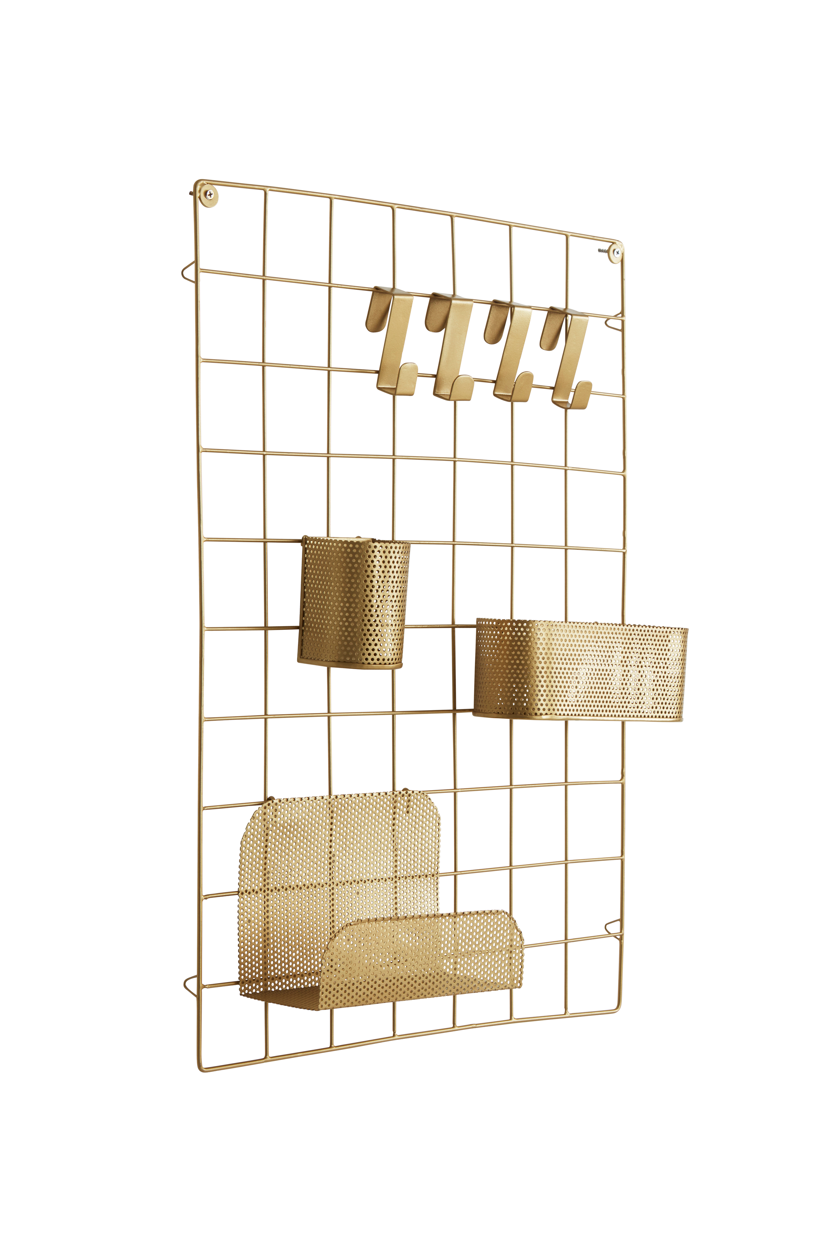 Väggförvaring av metall. Nätet fäster du på väggen och sedan hänger du upp medföljande fack, hållare och fyra krokar. Alla delar är flyttbara och du placerar dem som du vill. Ett praktiskt och snyggt sätt att organisera och strukturera.