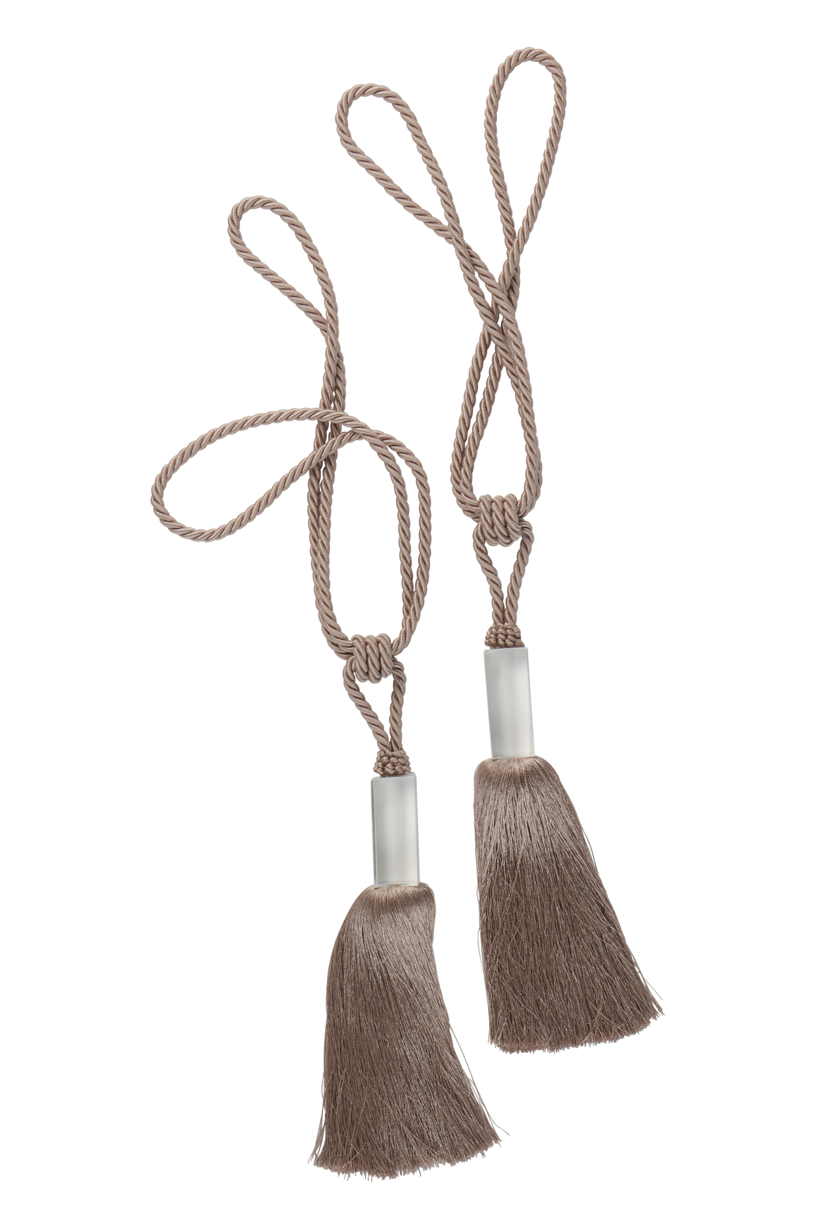 2-pack omtag av polyester. BIBI har en kraftig tofs på varje omtag med dekorativ fäste av transparent akrylglas.