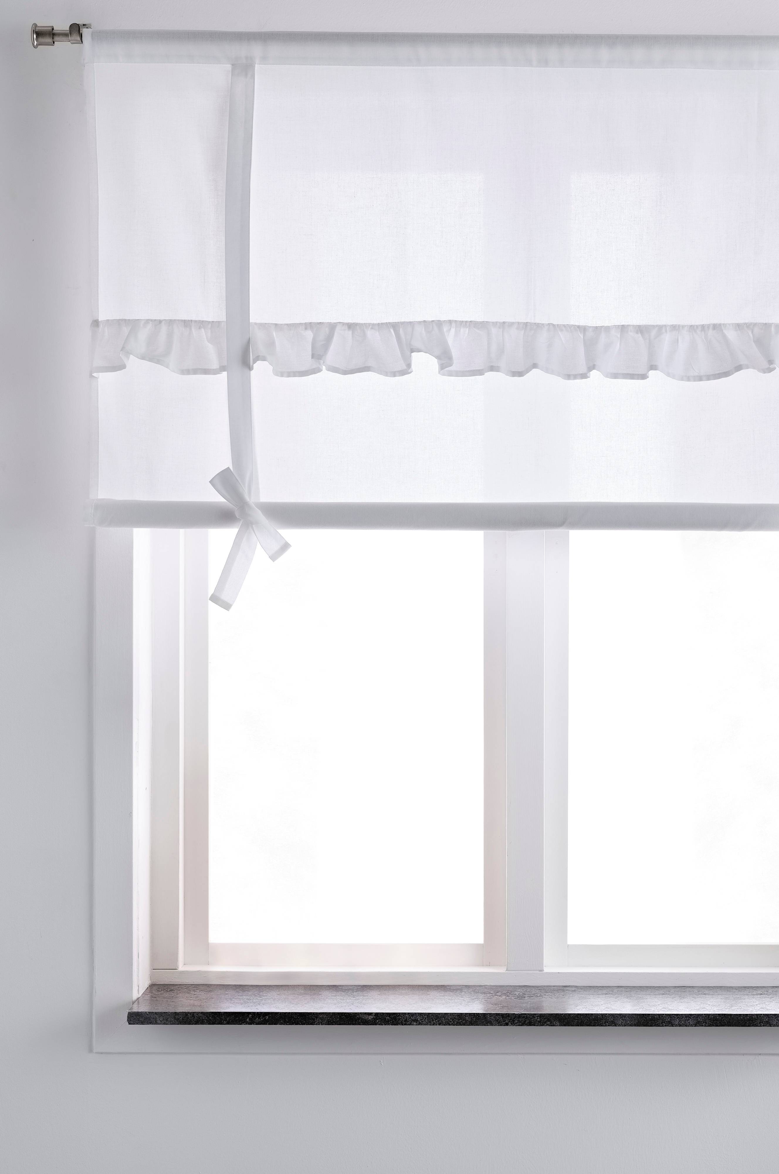 Roll up-gardin i ekologisk bomull. BILLY är en enfärgad gardin med dekorativa volangdetaljer. Hängs på vanlig gardinstång. Höjden regleras med knytband.