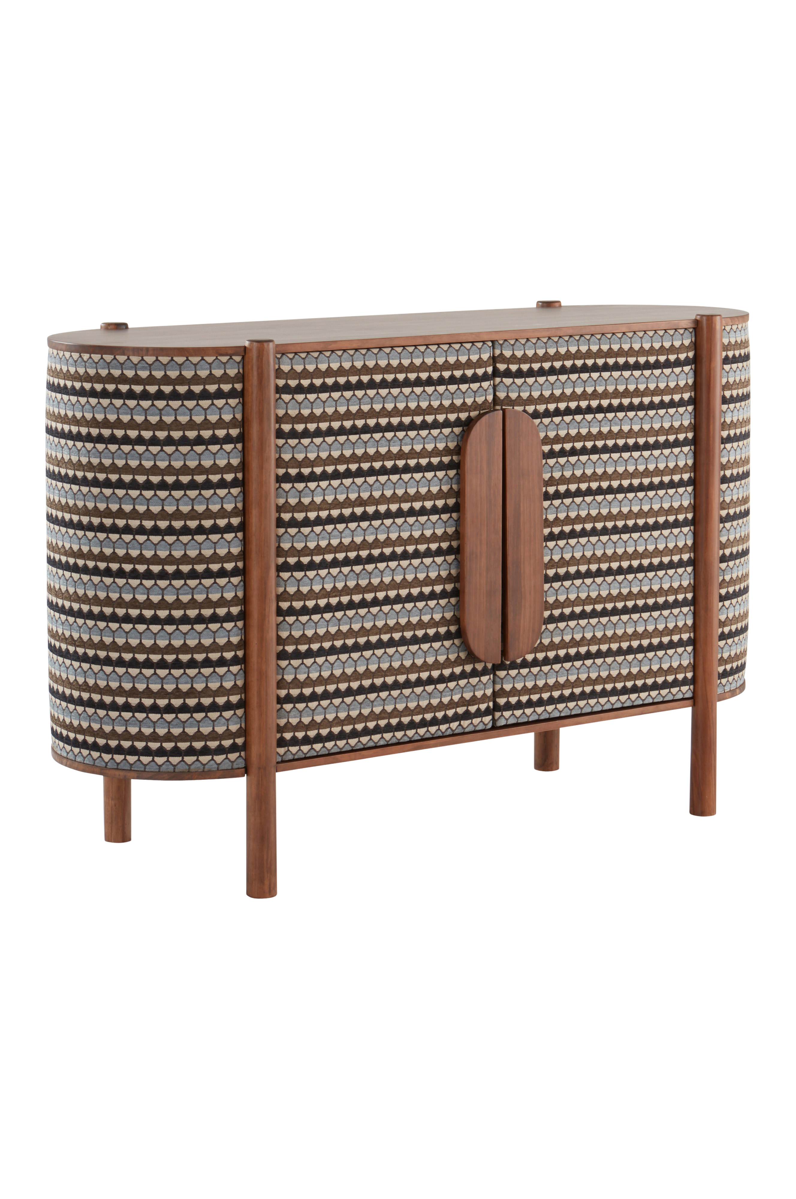BLESSANO är ett mycket speciellt och stilfullt skåp. Träslaget är massiv furu som kombinerats med textilklädda sidor, tillsammans med rundade former är skåpet uppseendeväckande samtidigt som det har en mjuk framtoning. Tyget är otroligt detaljerat och fint, det har vävt mönster med horisontell randning i jordnära färger.