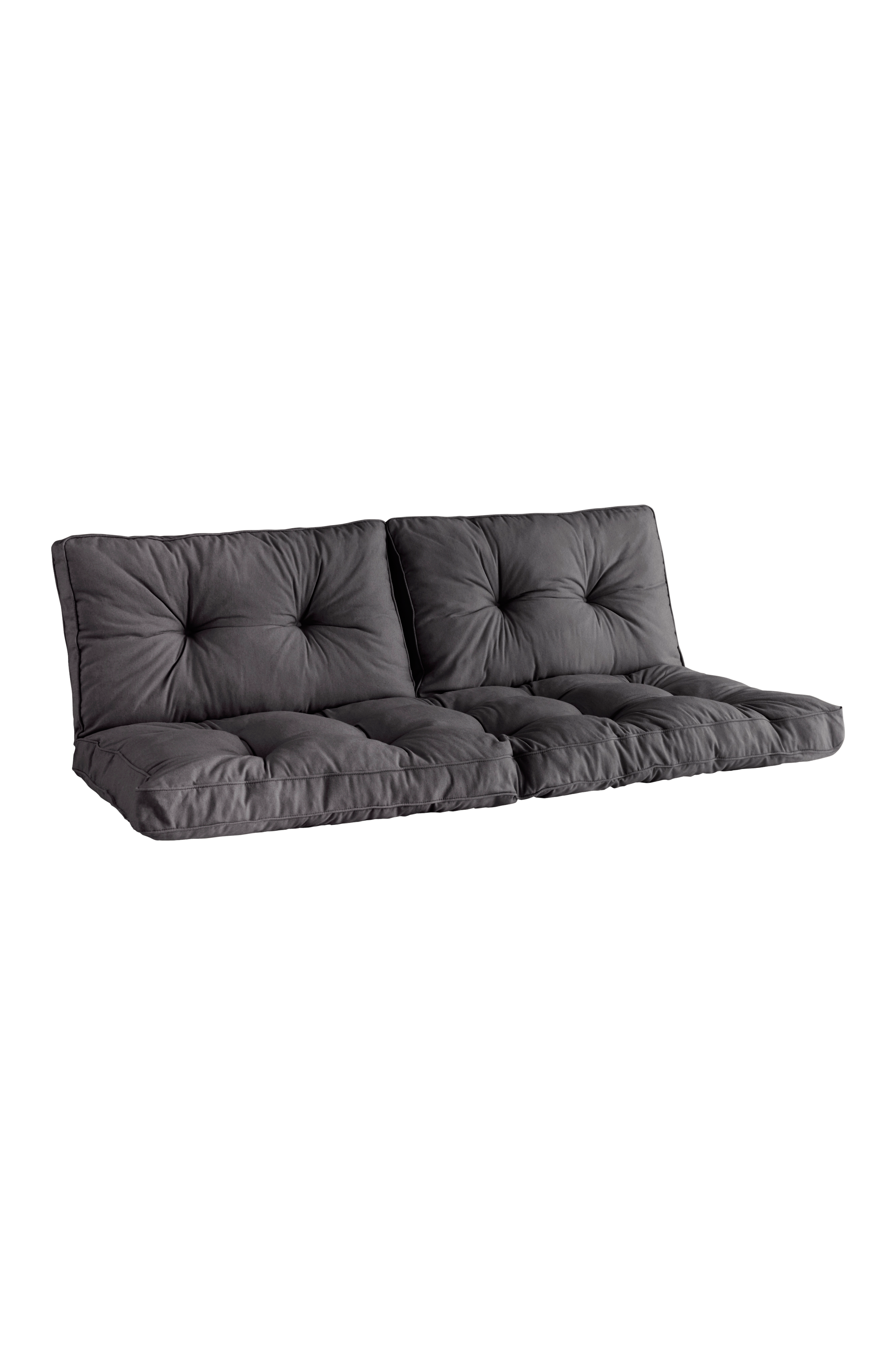 Dynset till utemöbler. Setet innehåller en dyna och två kuddar. Dynan och kuddarna är härligt mjuka och tjocka. Klädsel av bomull, polyester och återvunnen fiber och flockfyllning. Dynsetet passar till soffan i BOLONIA loungemöbel.
