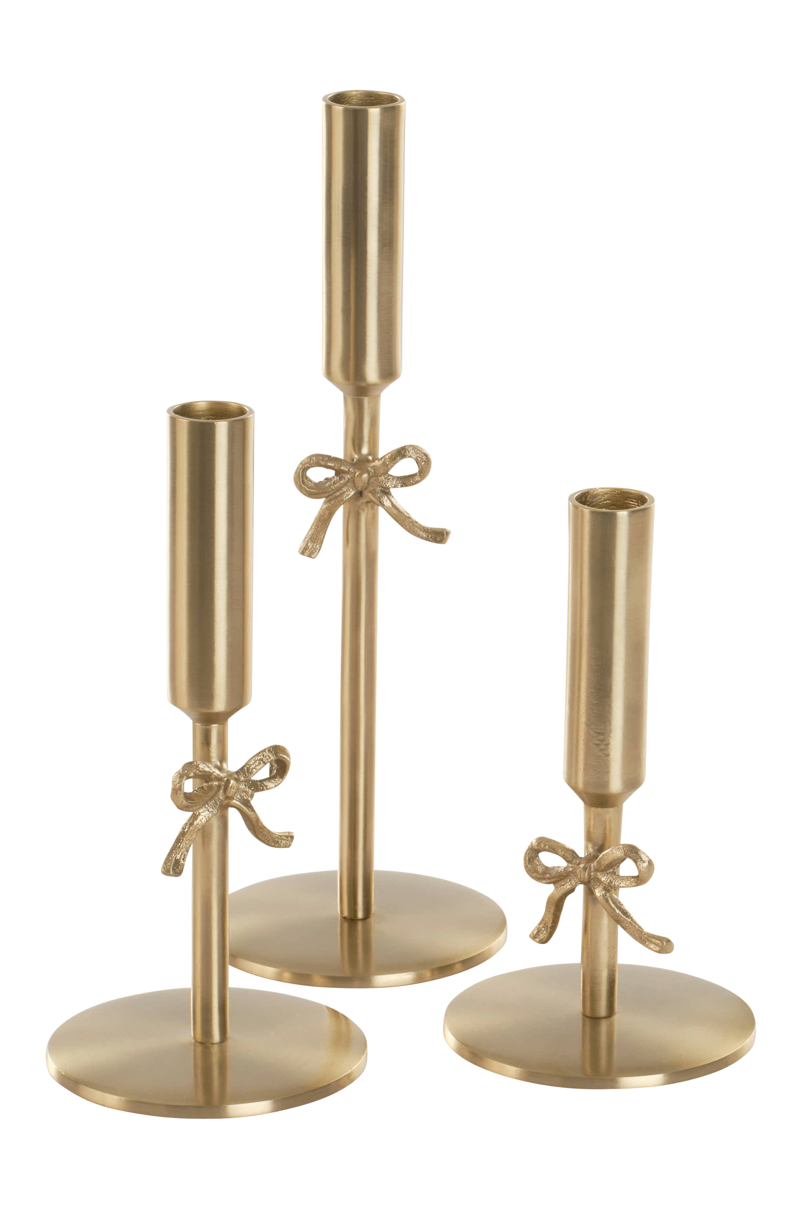 BOWY-ljusstakssetet har en charmig metalldesign med en dekorativ rosett. Denna uppsättning med tre ljusstakar tillför elegans och tidlös stil till alla inredningar och skapar en sofistikerad atmosfär. Perfekt för att förhöja din interiör med en touch av klass.
