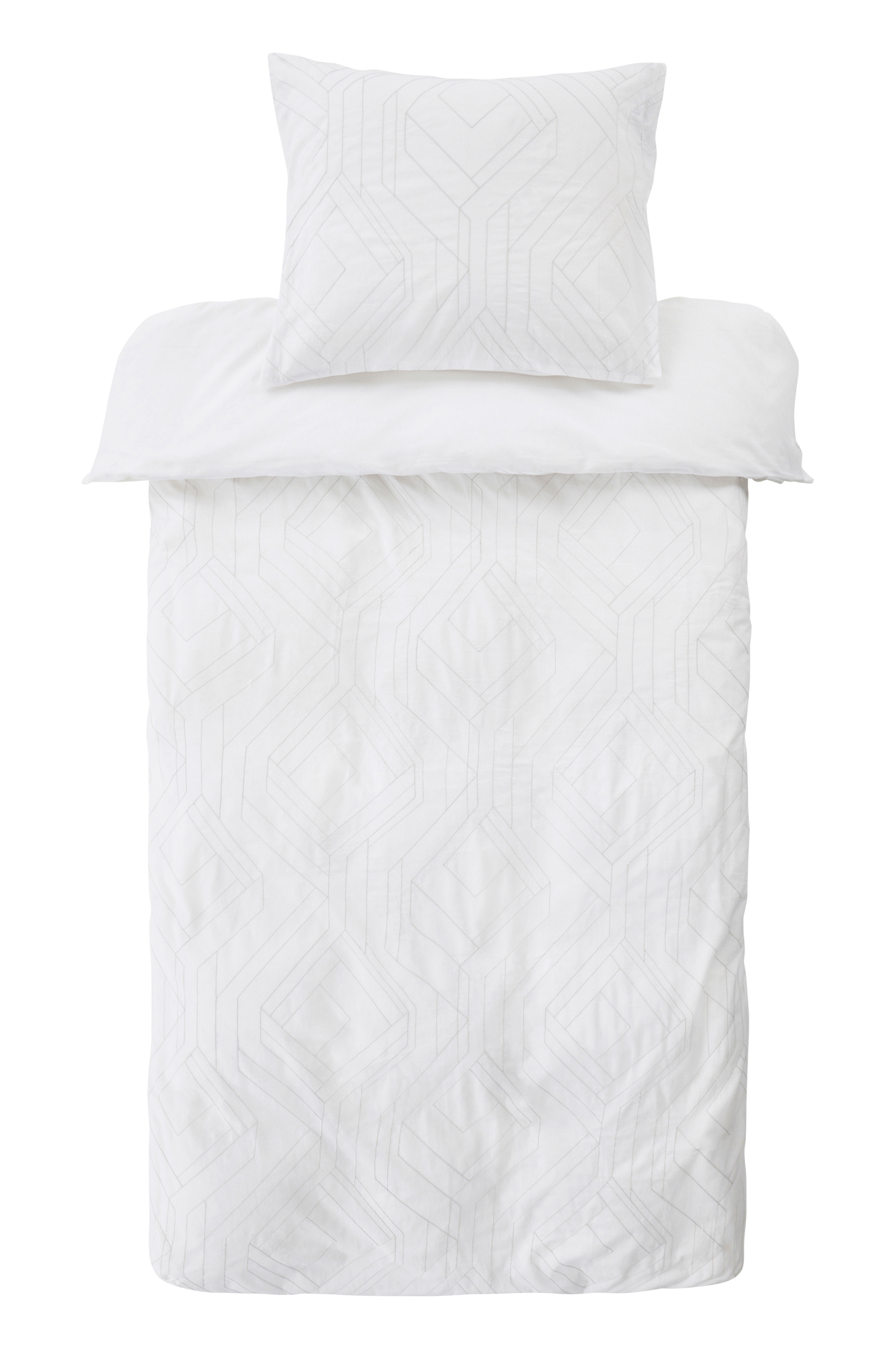 Påslakanset i 2 delar i behaglig bomull. Både påslakan och örngott har broderat mönster med tunn tråd i närliggande färg som ger ett fint, diskret mönster. Baksidan är enfärgad i samma tyg som framsidan. Bomull är behagligt att sova i, upplevs svalt och mjukt mot huden. Öppning i övre hörnen på påslakanet, som underlättar att trä påslakanet över täcket. Dragkedja för tillslutning. Trådtäthet på 144 tc. (Trådtätheten talar om antalet trådar, thread counts, per kvadrattum i ett tyg. Ju högre trådtäthet desto högre kvalité.)