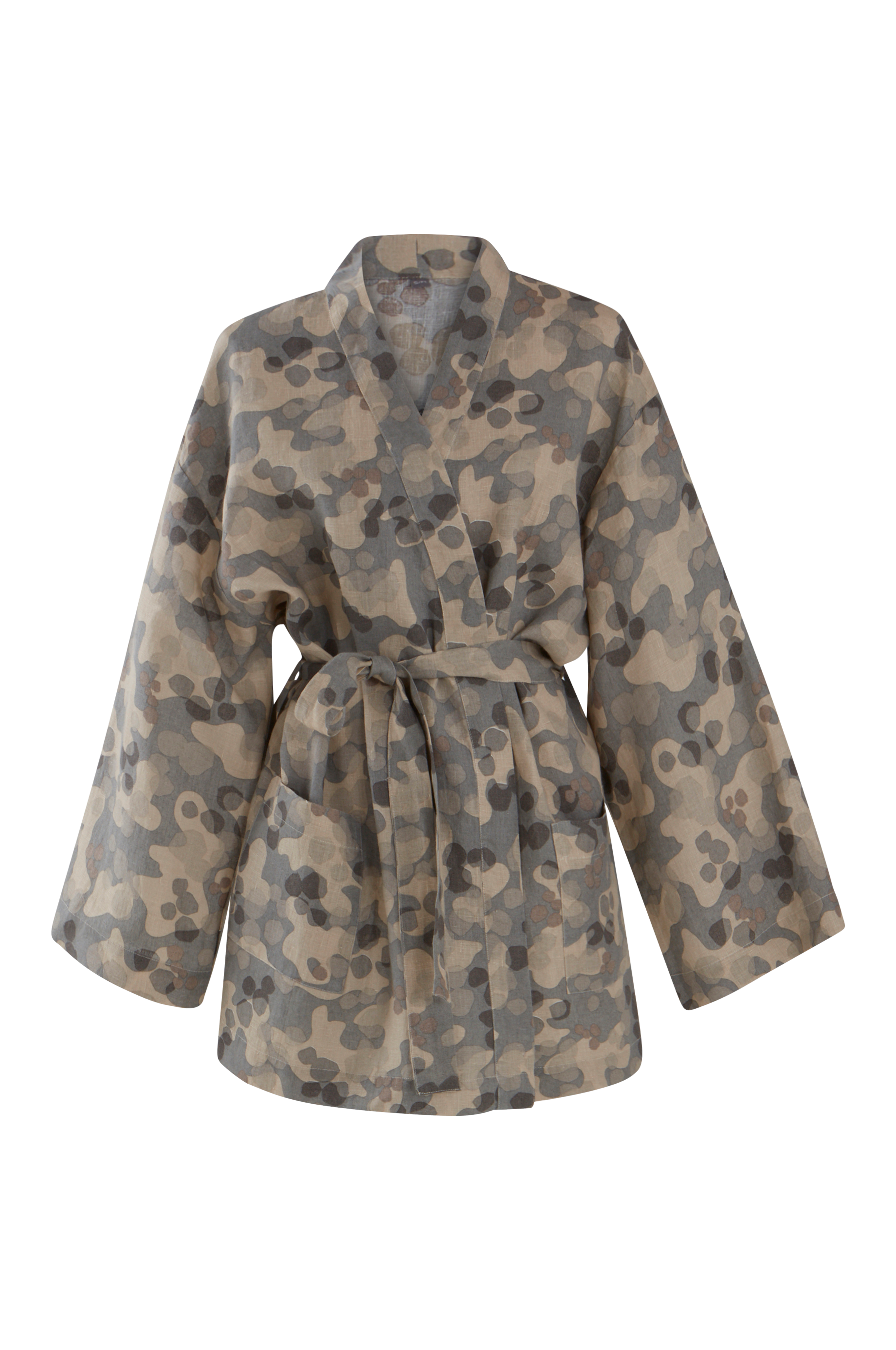 Kimono i kort modell av naturligt och behagligt linne med tryckt mönster som designats av Maria Carlberg. Den sköna linnekvalitén har tvättats för att bli härligt mjuk och skön. Mysig modell knytskärp i midjan och två framfickor.