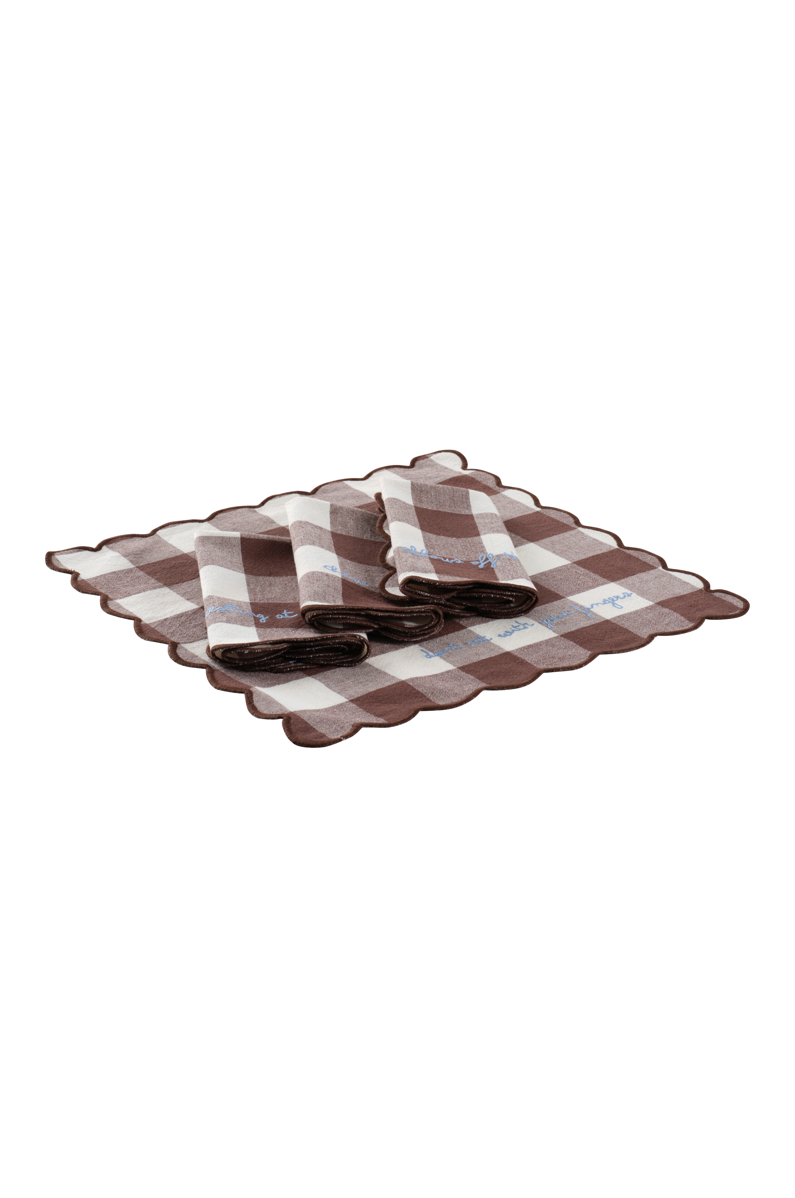 Servettuppsättningen CARLY gör ett djärvt intryck med vågiga kanter och detaljerat broderi. Denna uppsättning om fyra är tillverkad av garnfärgad rutig bomull och passar bra i moderna interiörer. Som en del av CARLY-familjen kan de kombineras med matchande produkter.