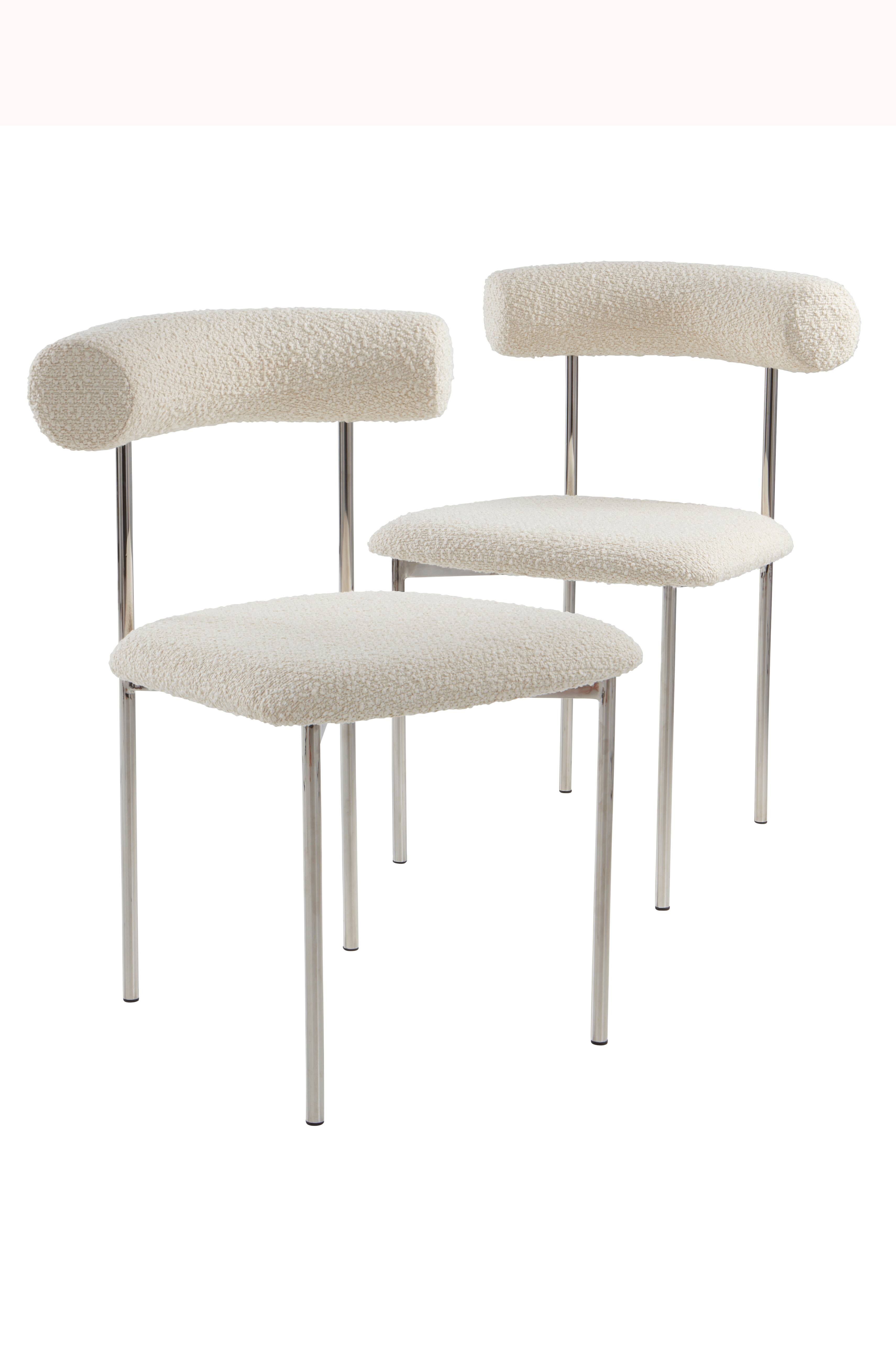 2-pack stolar med snygg och behaglig boucléklädsel i smakfull kombination med kromat stål. Sitsen och det smäckra, rundade ryggstödet är mjukstoppade, vilket gör stolen skön att sitta på, perfekt för långa härliga måltider. Bouclé är ett tyg där små öglor i olika storlek skapats genom vävtekniken, vilket ger liv och snygg effekt samtidigt som det är mjukt och skönt. Tyget är dessutom slitstarkt och tål 40000 Martindale. Stommen i sitsen är av plywood. Viss montering krävs. Monteringsanvisning medföljer.