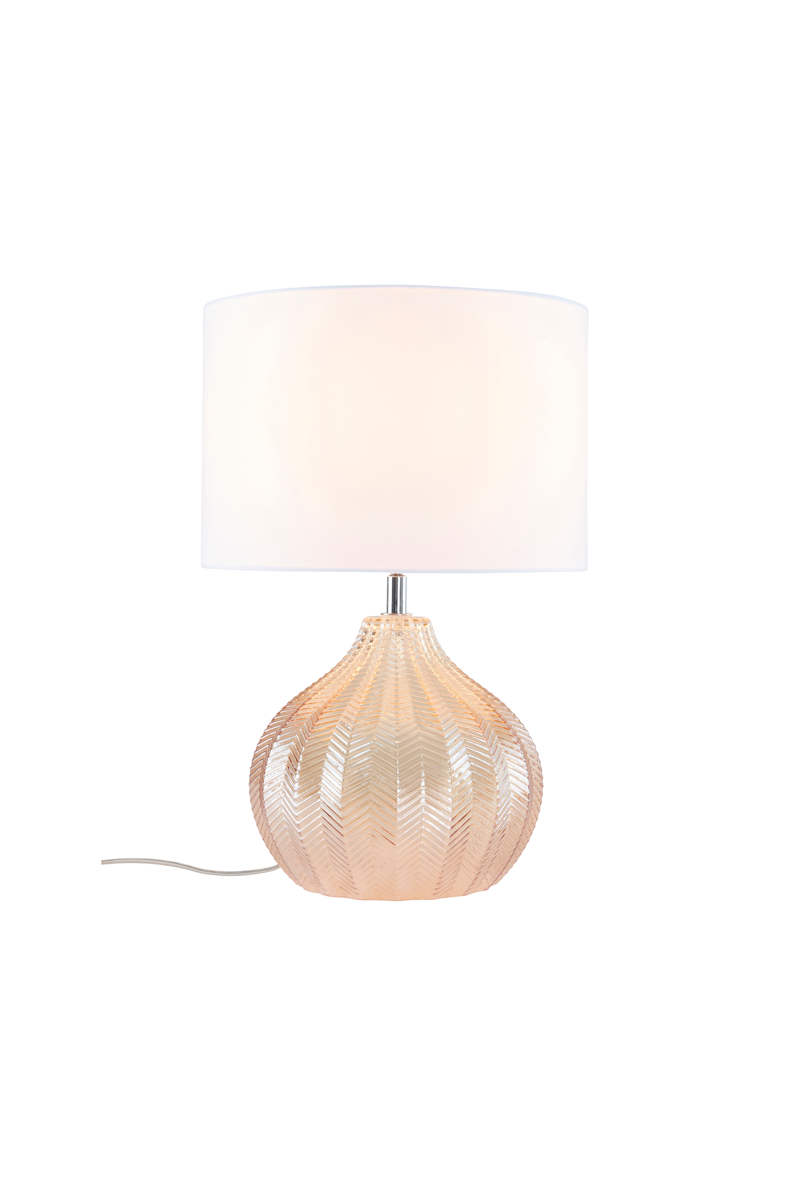 Bordslampa med vit textilskärm och fot av bärnstensfärgat glas. Den vita, raka skärmen i kontrast till glasfoten med sin mjuka färg bildar vacker kontrast. Det pressade glaset har ett fint fiskbensmönster som förhöjer. Transparent sladd med strömbrytare på, sladdlängd 2 m.