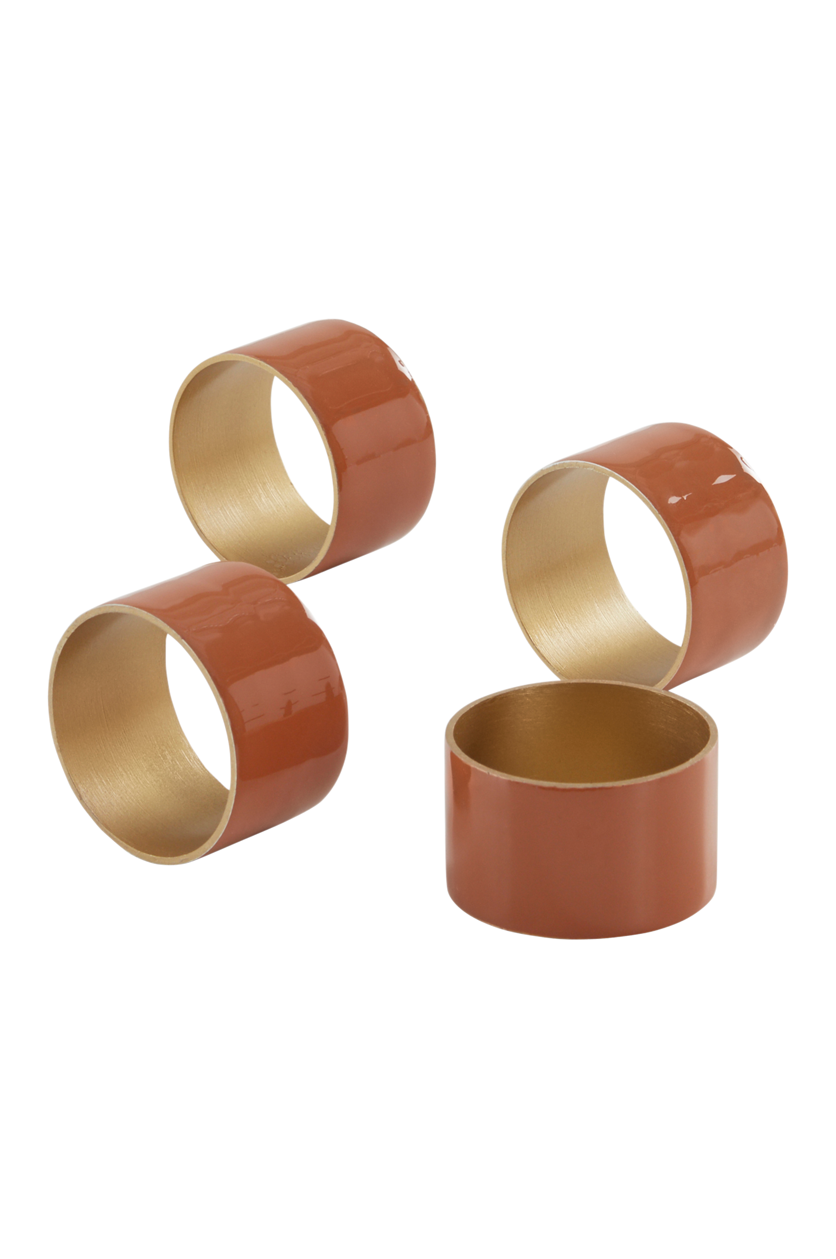 4-pack servettringar av aluminium. Servettringarna har pläterad insida i mässing- eller guldfärg och utsidan är emaljerad i mustig färg.
