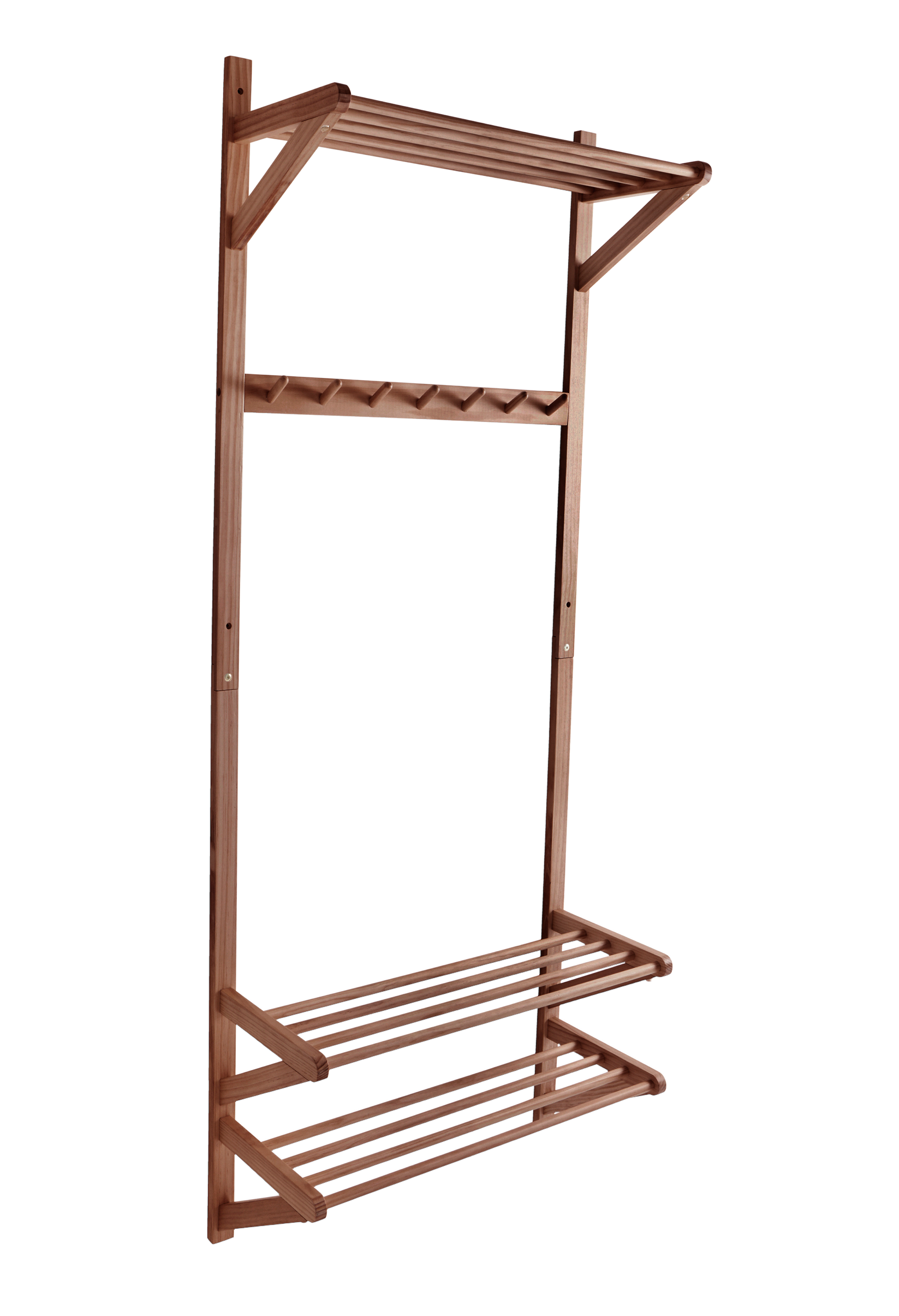 Klädhängaren COLE är av FSC-märkt furu med såpad yta. Klädhängaren har en hatthylla, en kroklist och två skohyllor. Kroklisten har sju raka hängare som är vinklade uppåt så att kläder och väskor hänger stabilt utan att halka av. Det fungerar fint att hänga galgar på yttersta rundstaven på hatthyllan (galgar medföljer ej). Klädhängaren skruvas fast på väggen på önskad höjd. Viss montering krävs. Monteringsanvisning medföljer.