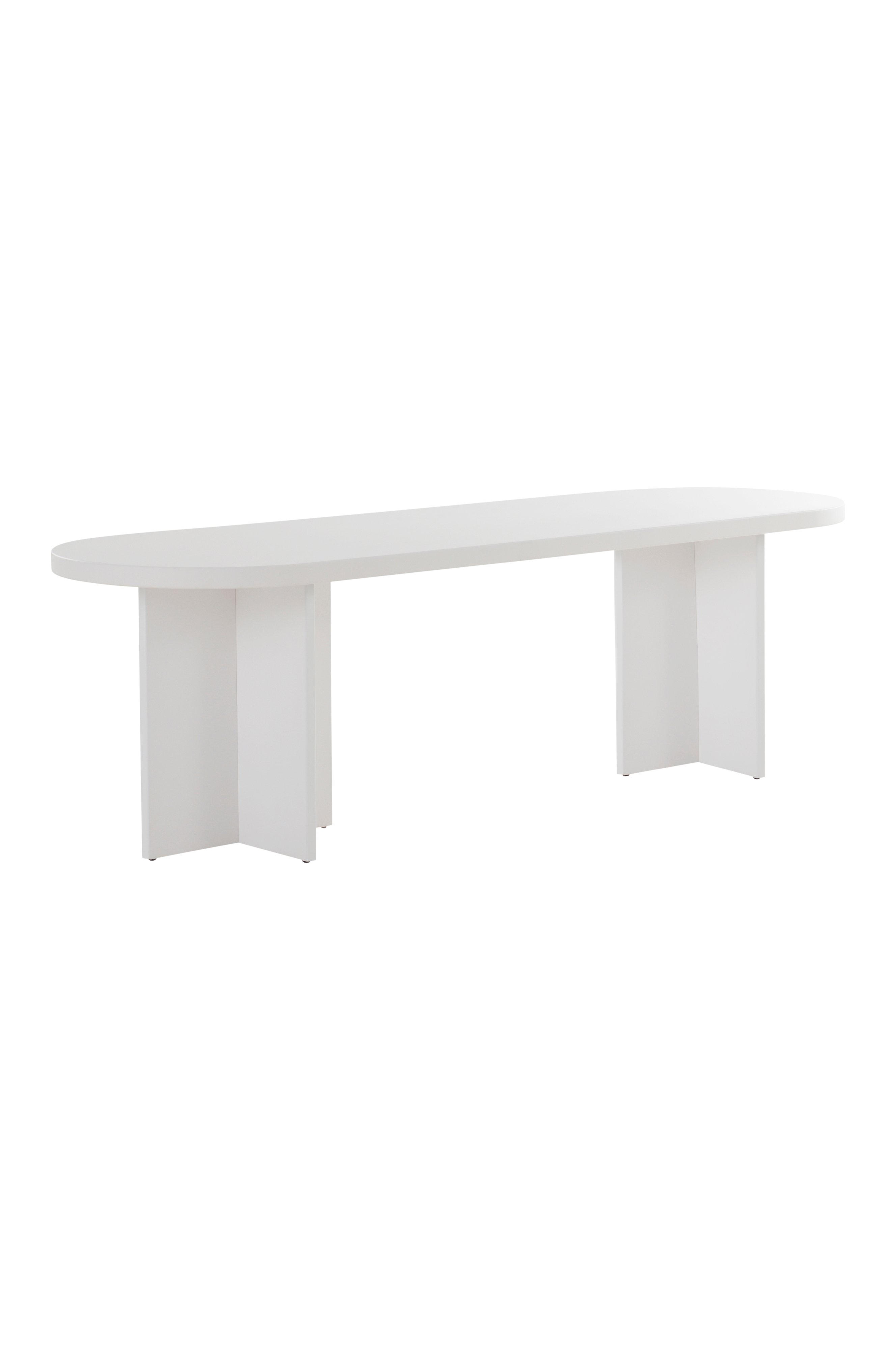 Ovalt bord av MDF som har pulverlackerats med vattenbaserad lack. Bordets form är harmonisk, det smälter in och har en mjuk framtoning. De stabila benen i vardera änden ger bordet karaktär och benens placering gör det bekvämt att sitta vid bordet. Metallbeslag medföljer för montering av bordsskivan. Viss montering krävs. Monteringsanvisning medföljer.