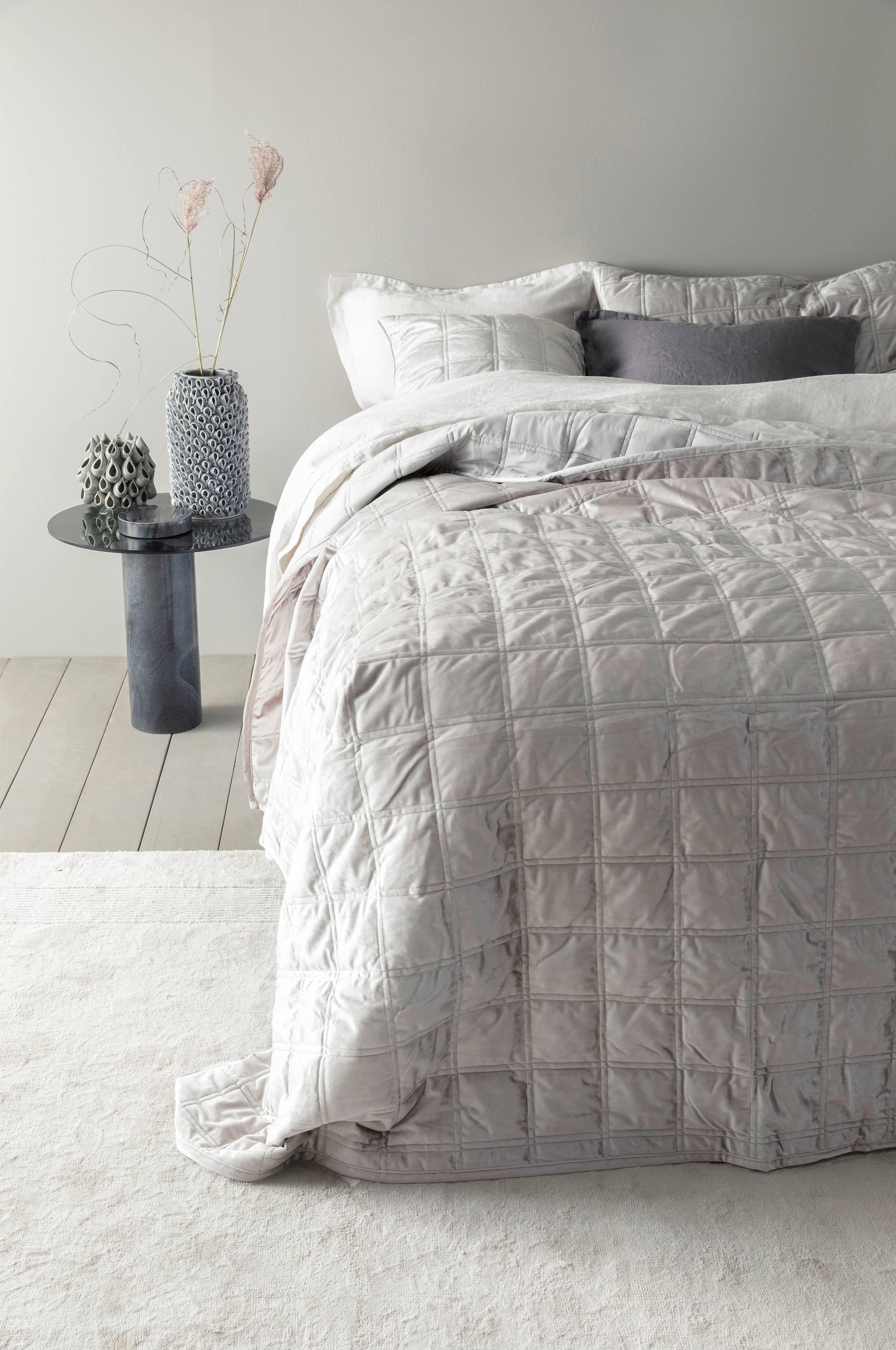 Överkast för dubbelsäng. Överkastet är i quiltad sammet med sytt rutmönster och matchande sammetsbaksida. Kuddfodral medföljer ej, köps separat.