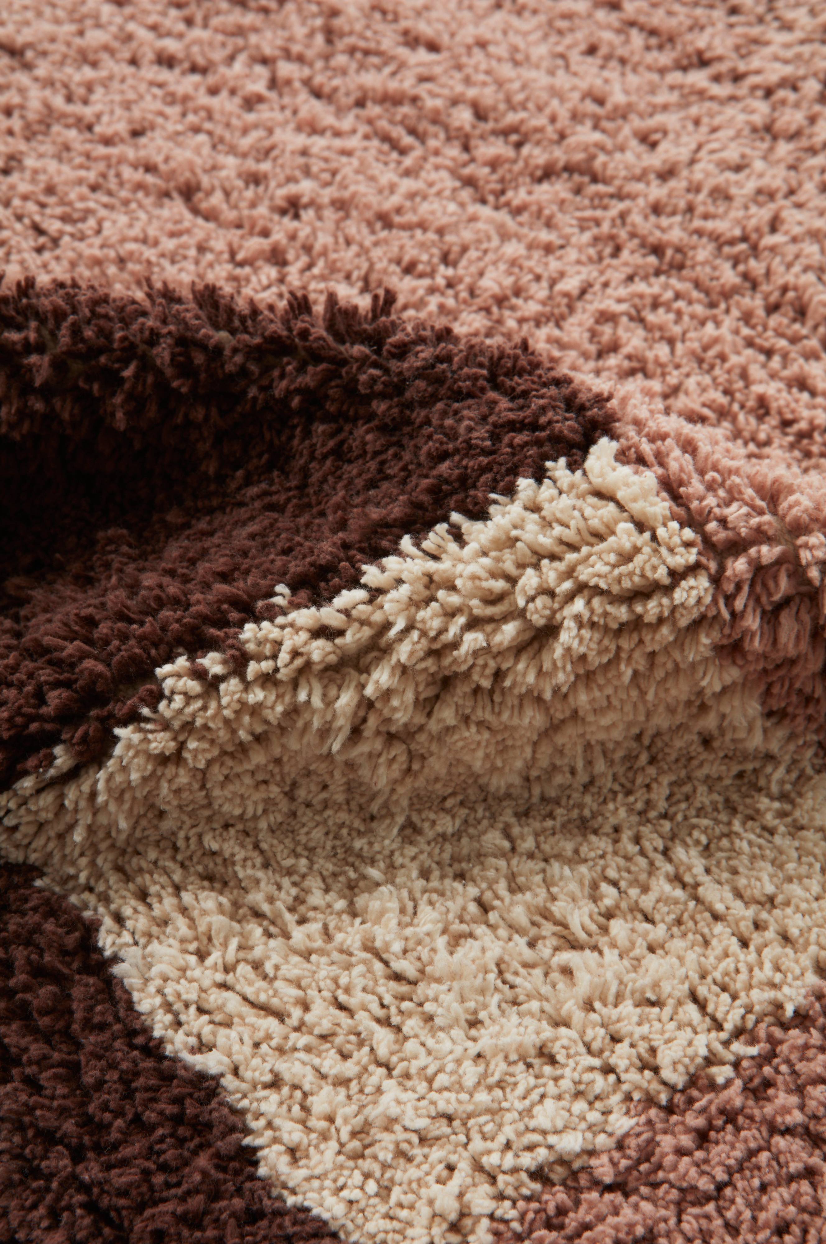 Tuftad bomullsmatta med trefärgat, geometriskt mönster i kontrasterande färger. Den följsamma mattan har mjuk och behaglig lugg. Lugghöjd 1 cm. Tjocklek 1,1 cm. 1500 g/m².