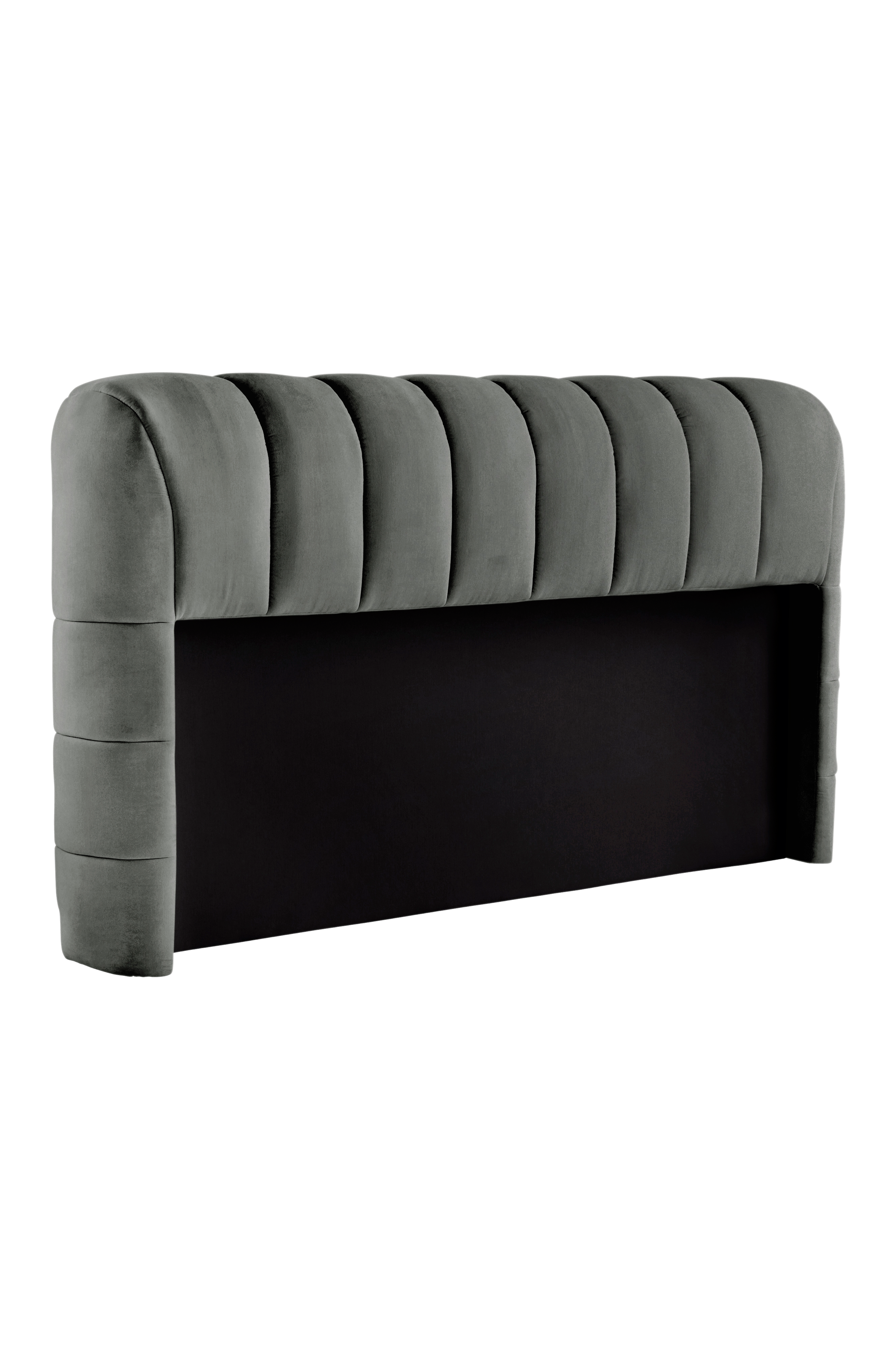 Sänggavel som är mjuk och rund i formen, mycket generös och inbjudande. Sänggaveln är mjukt vadderad och klädd med ett neutralt och lättmatchat, enfärgat polyestertyg, lodräta sömmar gör sängen riktigt snygg. Allt trä i sängen är FSC-certifierat. Stommen är tillverkad av furu och plywood. Denna sänggavel har inte väggfäste, men den står stabilt. Madrass/resårmadrass ingår ej.