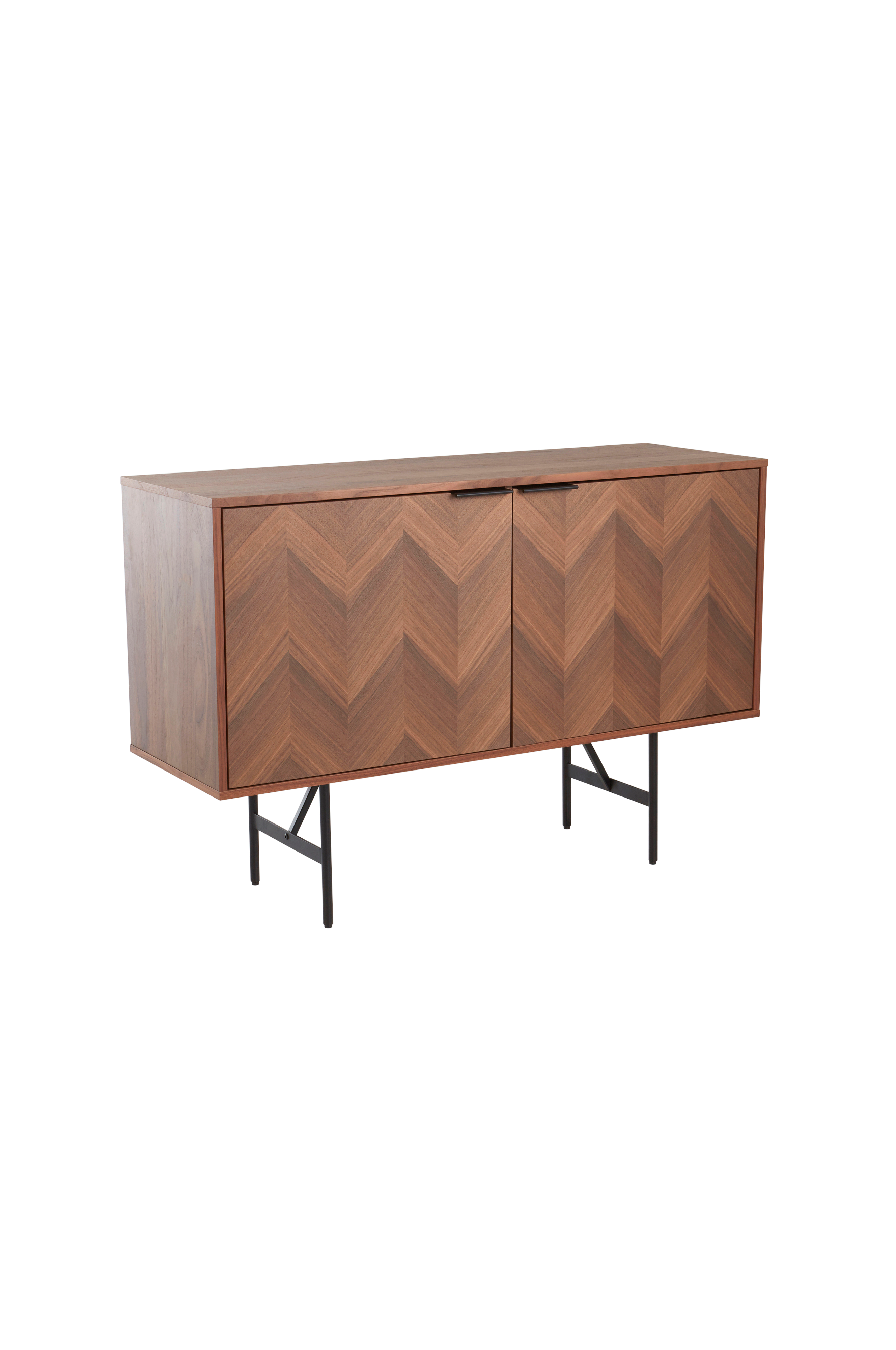 Retroinspirerat sideboard i valnötsfaner med fiskbenslook och metallben. Bordet har två luckor och hyllplan med plats för förvaring. Viss montering krävs. Monteringsanvisning medföljer.